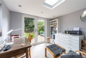 *Good size garden with gravel and paved patio area, leading to lawned area with a mix of flower beds and shrubs. Lockable storage to side of study.