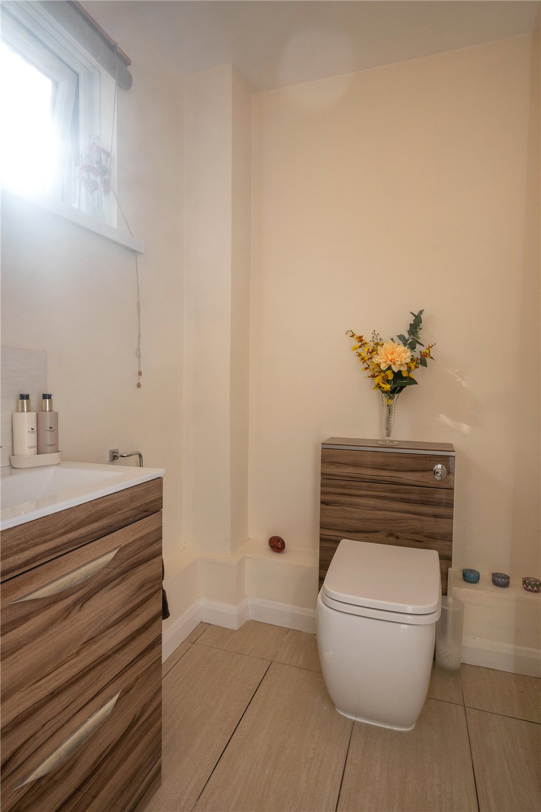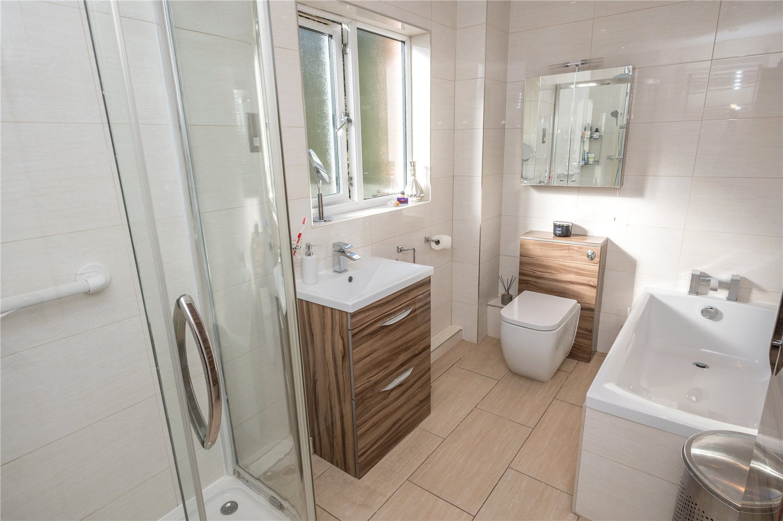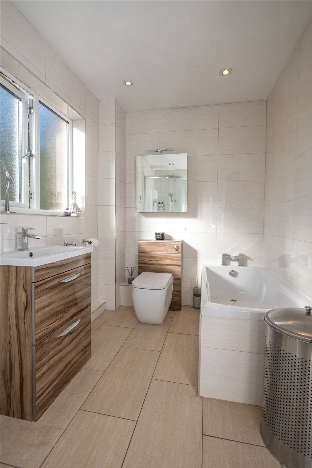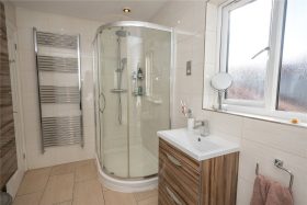 The fully tiled bathroom has a white suite comprising panelled bath, low level w.c. with concealed cistern, feature wash hand basin with cosmetic drawers below, curved corner shower cubicle and chrome heated towel rail.