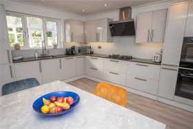 The modern breakfast kitchen has a range of stylish high gloss base and drawer units with quartz worktops with inset sink unit & instant hot water tap, integrated dishwasher, washing machine & fridge/freezer, matching wall units and pull-out storage unit, two integrated ovens and gas hob with extractor fan over, wood effect flooring, space for breakfast table and door to the rear garden.