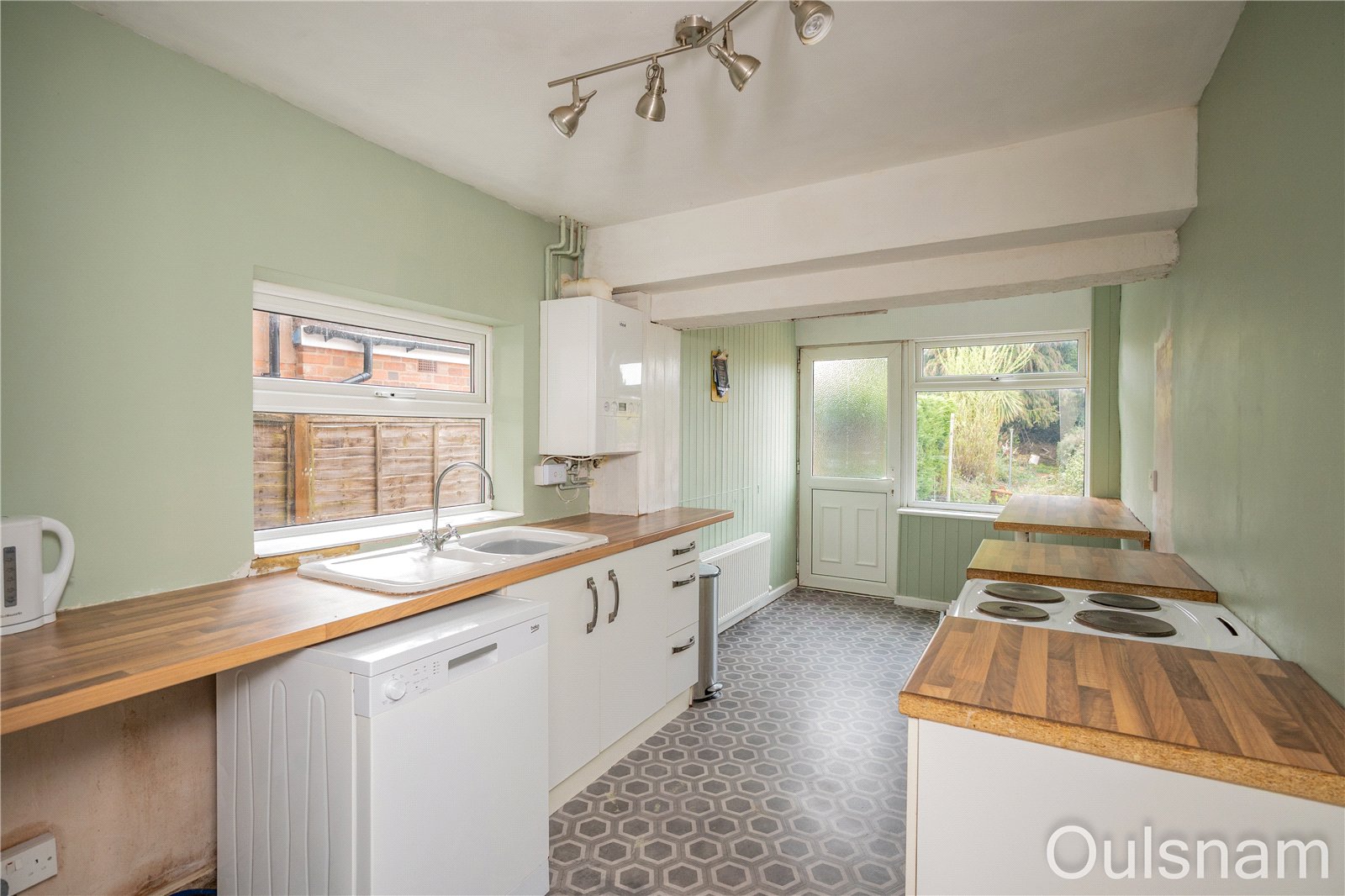 Kitchen which has base units with worktops over with an inset stainless steel sink drainer. There is a freestanding electric cooker and connections for further appliances. There are windows looking out to the side and the rear of the property and a door which opens out to the rear garden.
