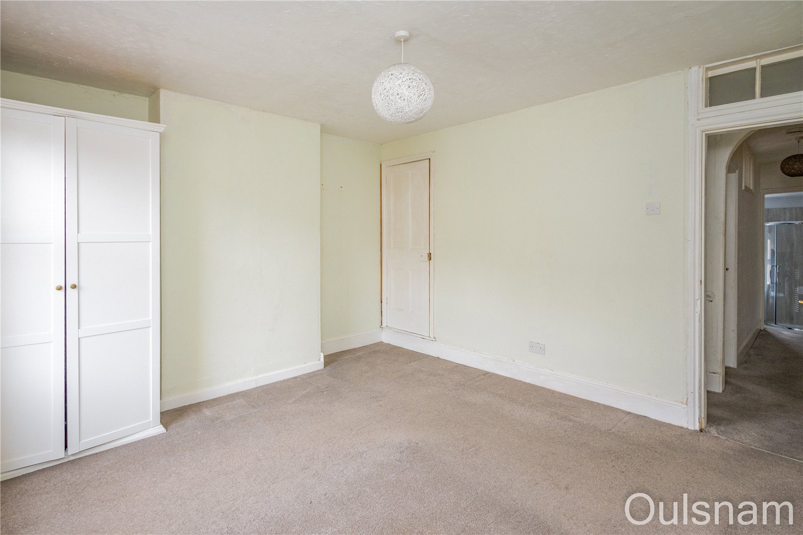 Bedroom one which has access to a storage cupboard and a window looking out to the front of the property.
