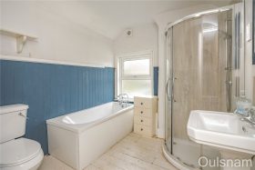 Bathroom which has a bath, an enclosed shower cubicle, a wash hand basin, a low level toilet and a window looking out to the rear of the property.