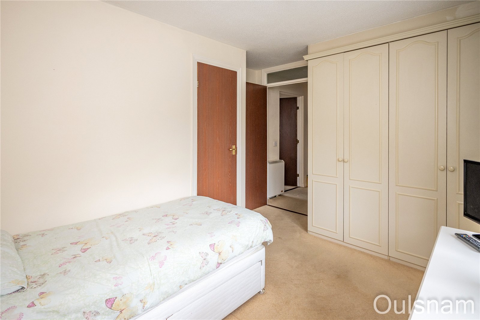 Bedroom which has access to fitted wardrobes and a storage cupboard and a window looking out to the side.