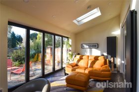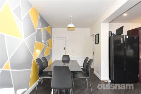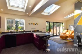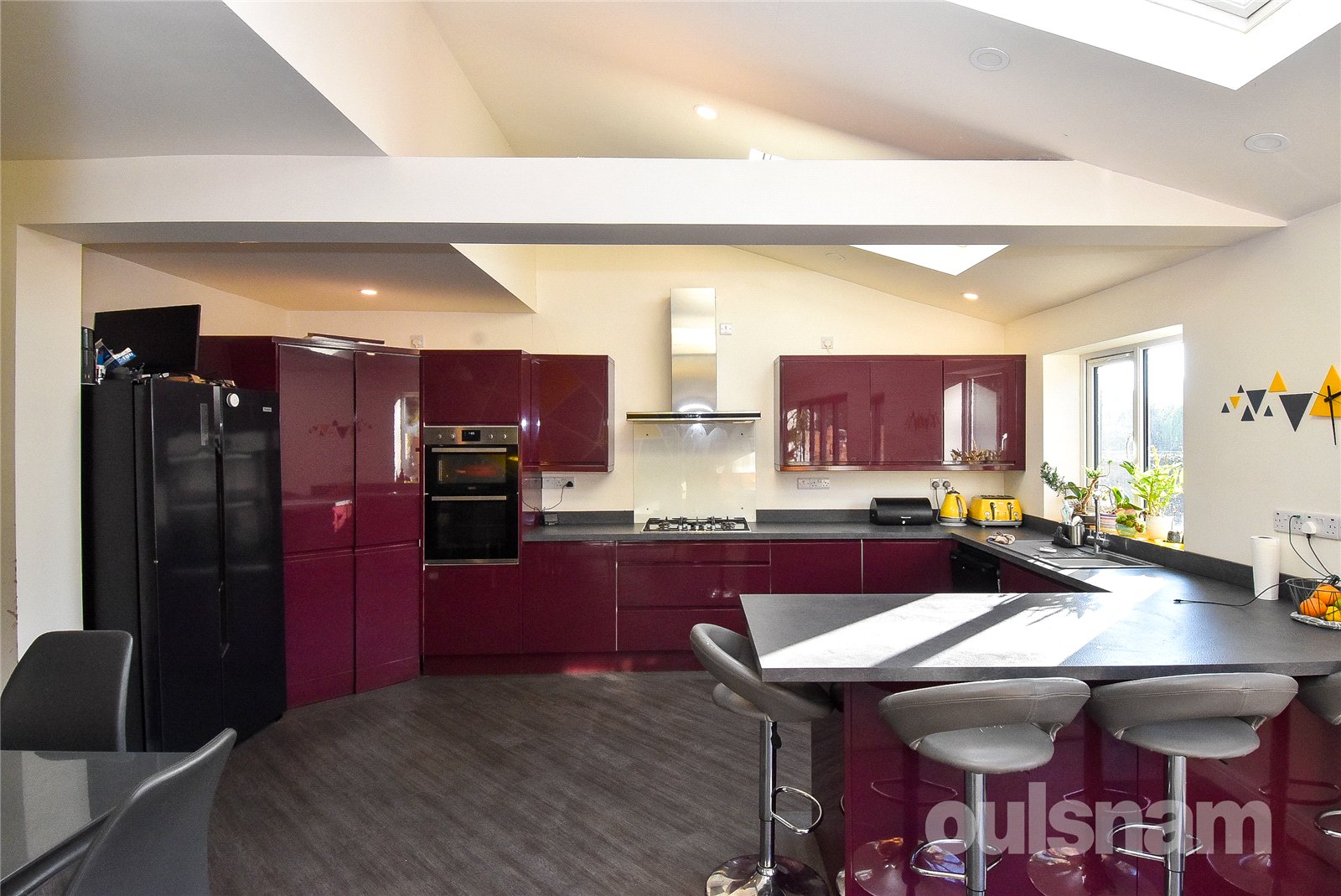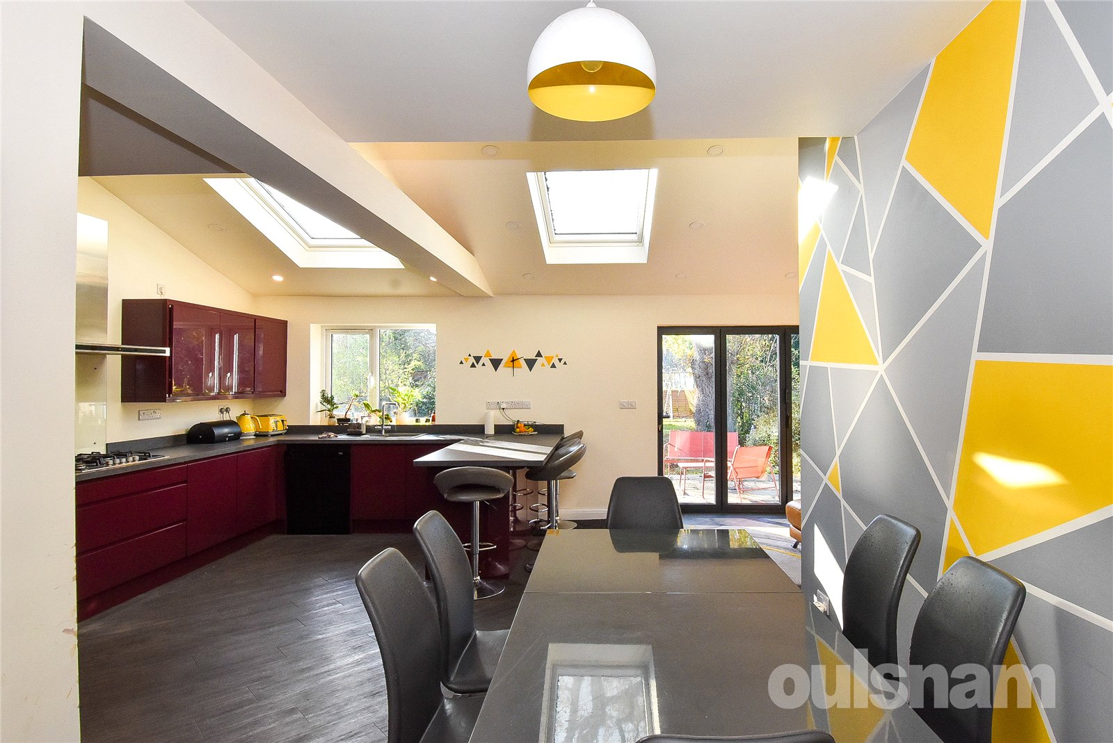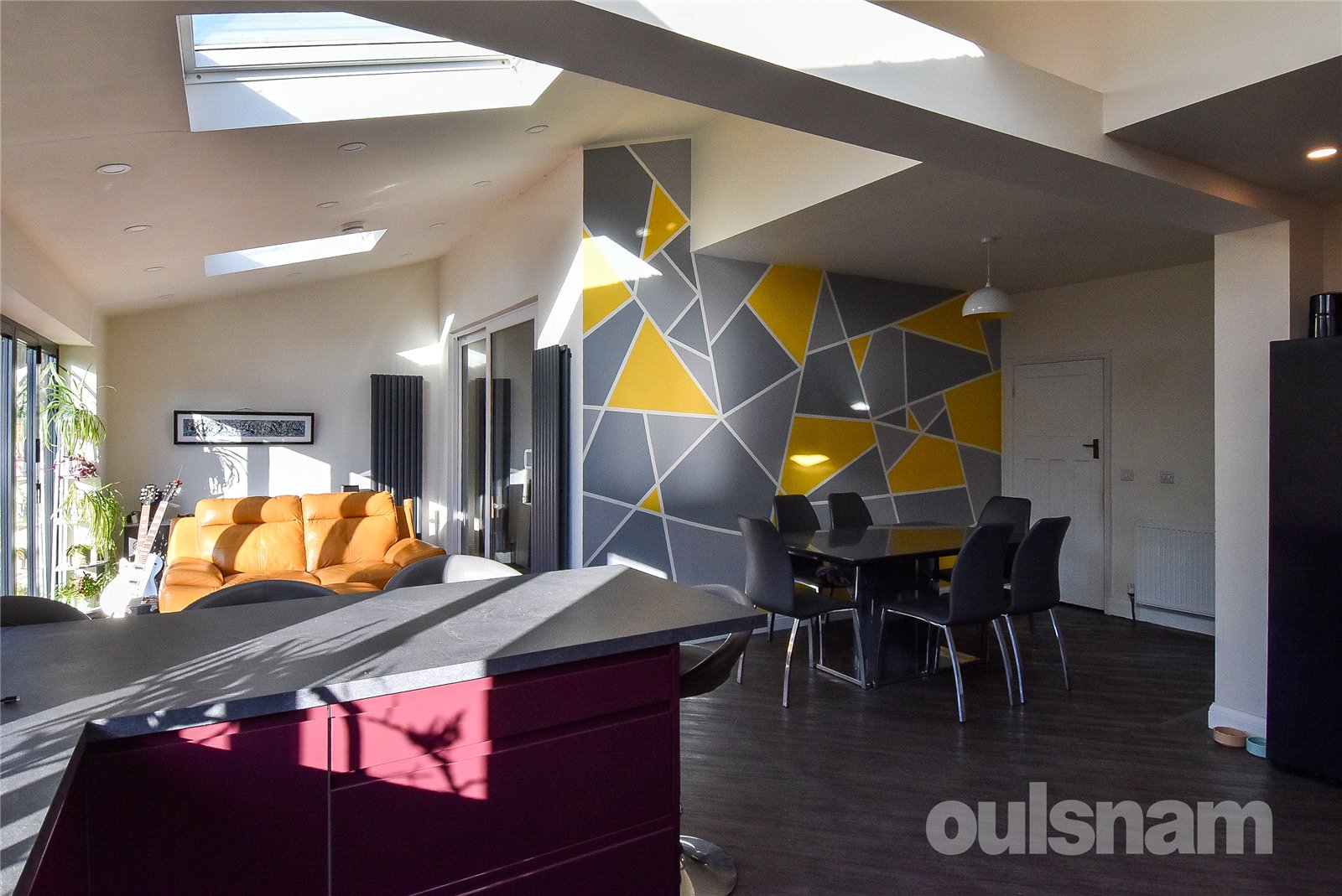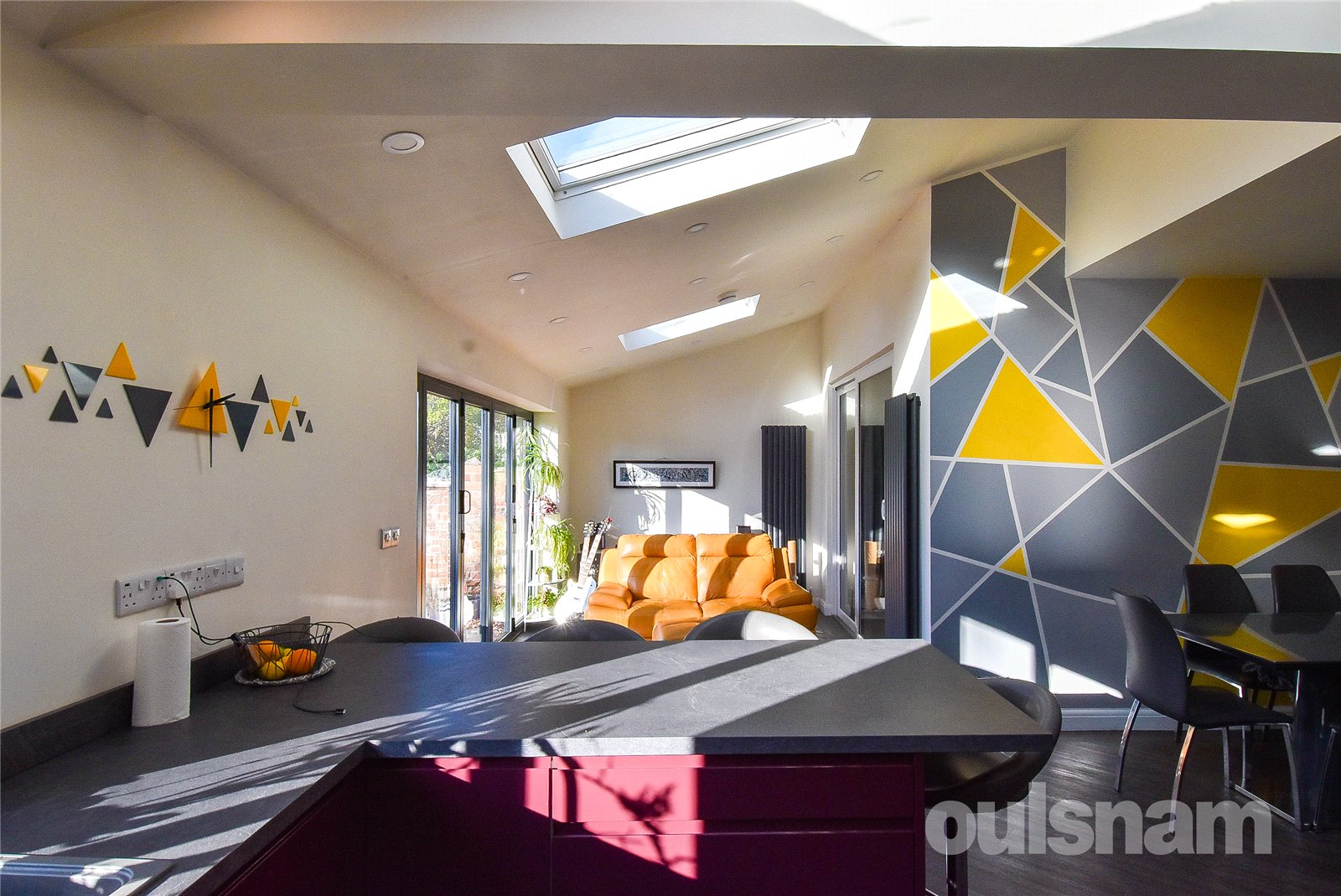 * The spacious kitchen–diner is fitted with a range of base cupboards and matching wall-mounted units, offering excellent storage and a clean, coordinated finish. It features a built-in oven, grill, hob and extractor, along with designated spaces for both a fridge-freezer and a dishwasher. The kitchen has been thoughtfully extended to create a versatile open-plan layout, incorporating a breakfast bar, a generous dining area and an additional living space—perfect for modern family living and entertaining. Bi-fold doors open out to the garden, while skylights above flood the room with natural light, giving the entire space a bright and contemporary feel.
