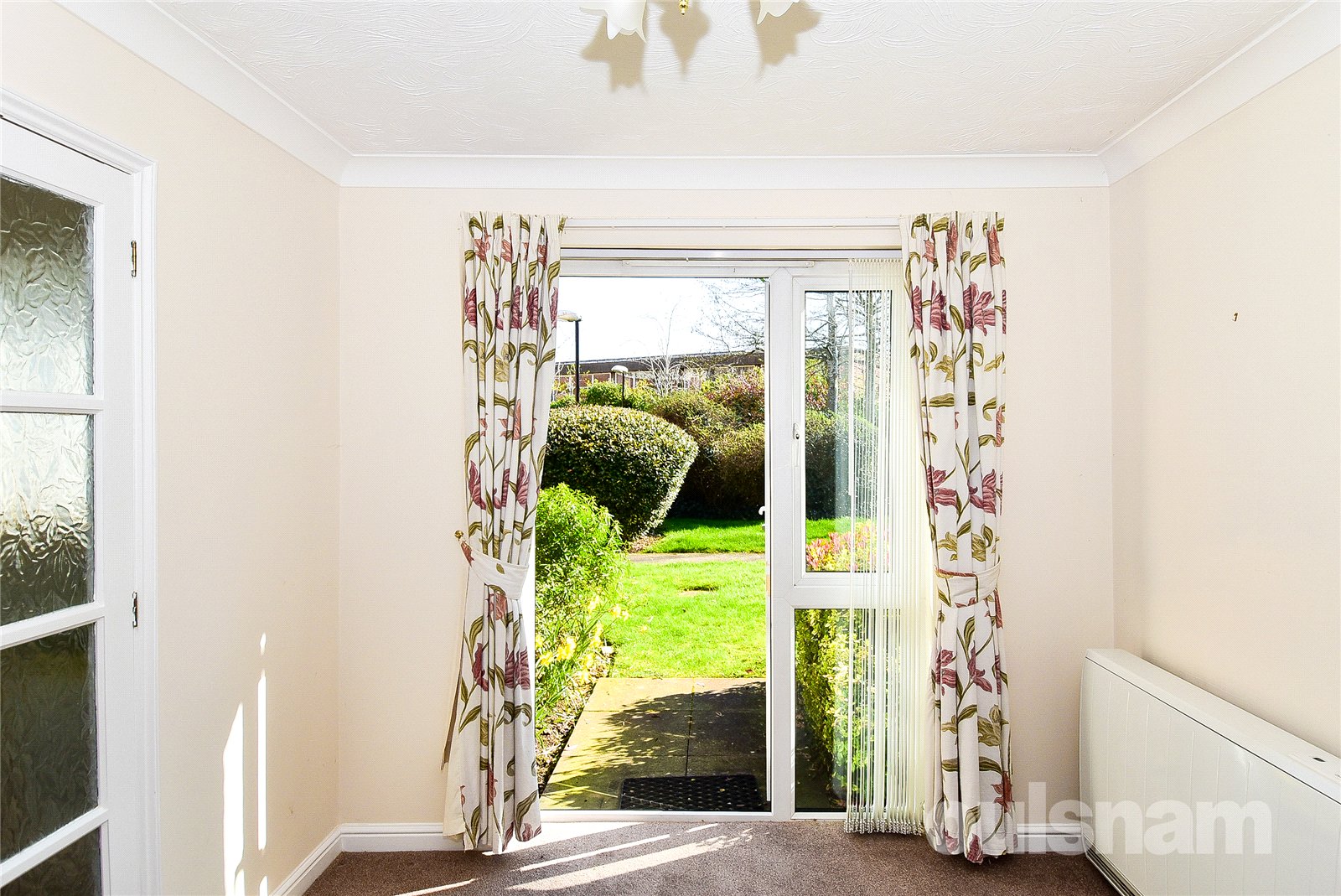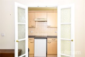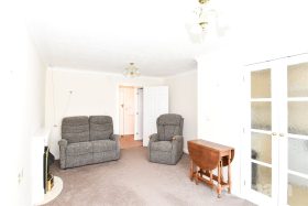 * A generously sized reception room, offering a bright and comfortable living space, enhanced by a feature fireplace creating a focal point. Double doors provide an open flow through to the kitchen, while a separate door gives direct access to the communal grounds.