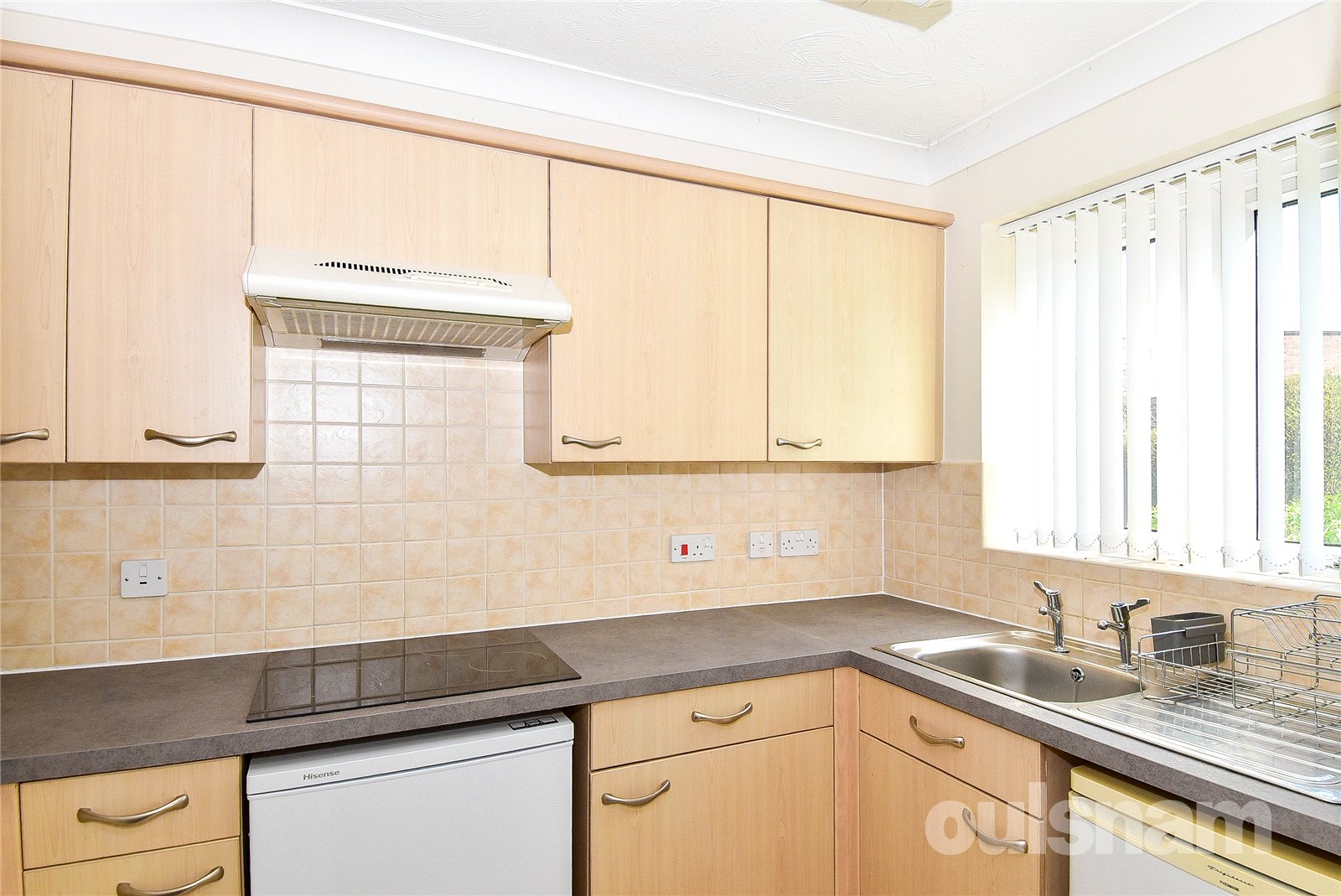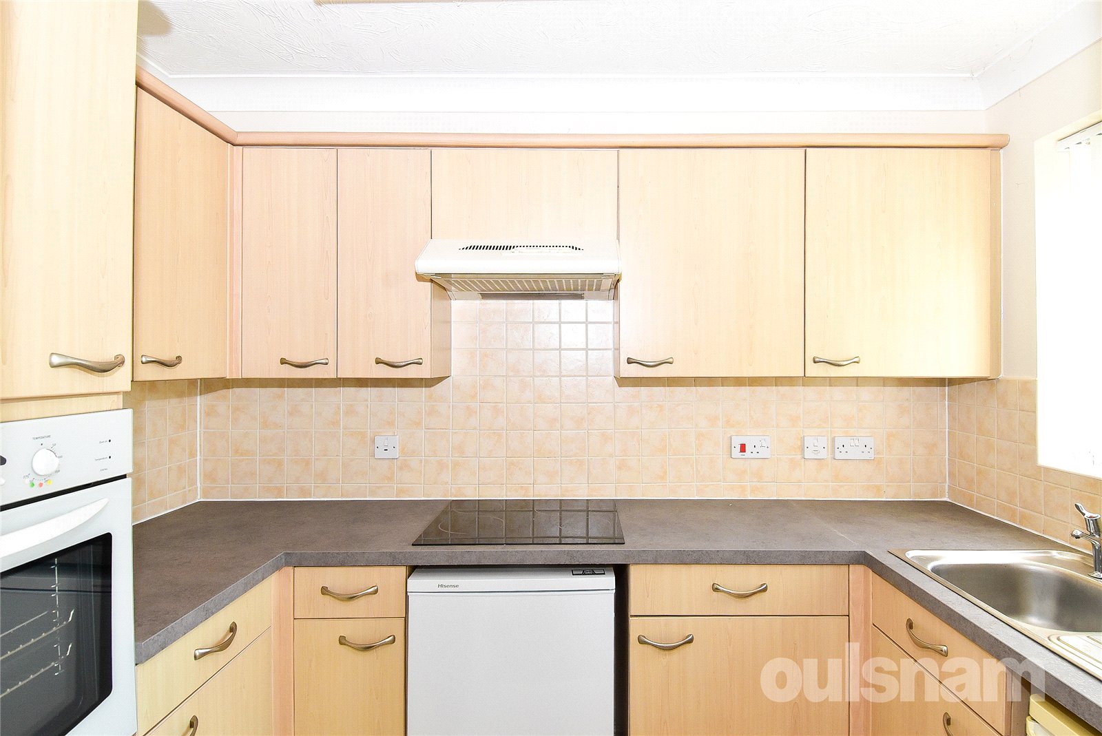* A well-appointed kitchen fitted with a range of base and wall-mounted units, incorporating an integrated cooker, hob and extractor fan, with space provided for an undercounter fridge and freezer.