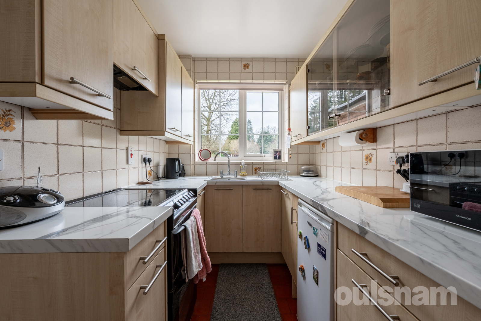 * Working kitchen comprising of a range of wall and base units to include glass display unit, stainless steel sink unit and mixer tap, space for cooker and refrigerator, quarry tiled flooring