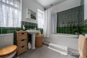 * Good sized bathroom comprising of: sunken bath with shower fitment and mosaic tiled border (approached via step) wash hand basin and low level WC