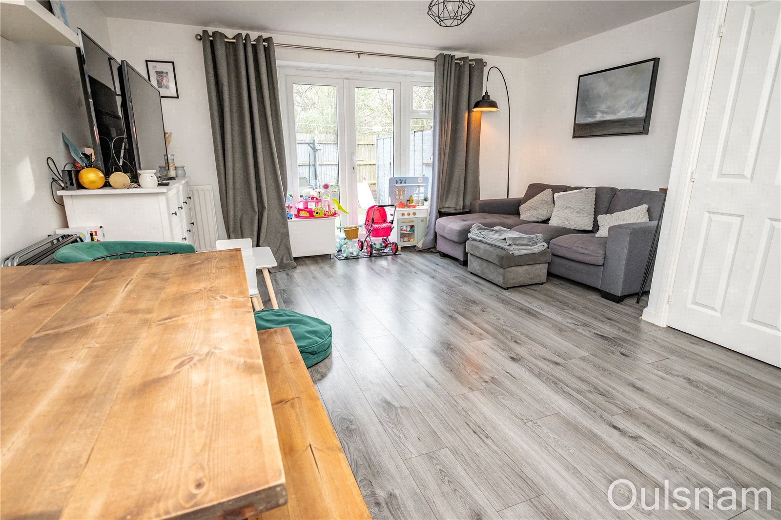 Living space which has windows looking out to the rear of the property and French doors which give access to the rear garden. There are stairs which ascend to the first floor with a storage cupboard underneath.