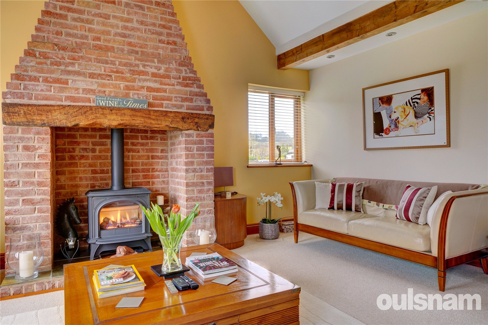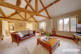 • Lounge with multi aspect windows, vaulted ceiling and original beam work, attractive exposed brick fireplace with gas log burning effect stove.