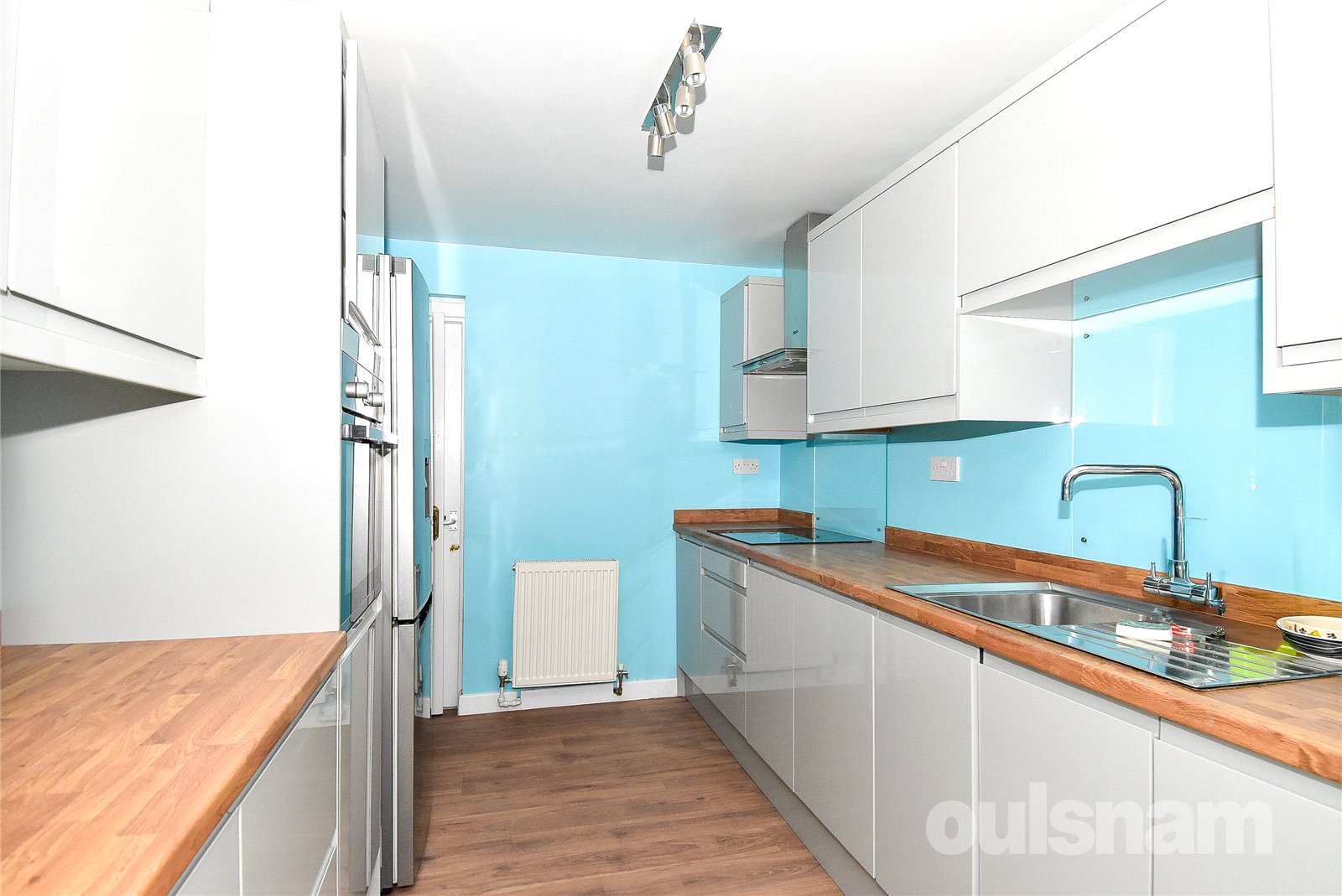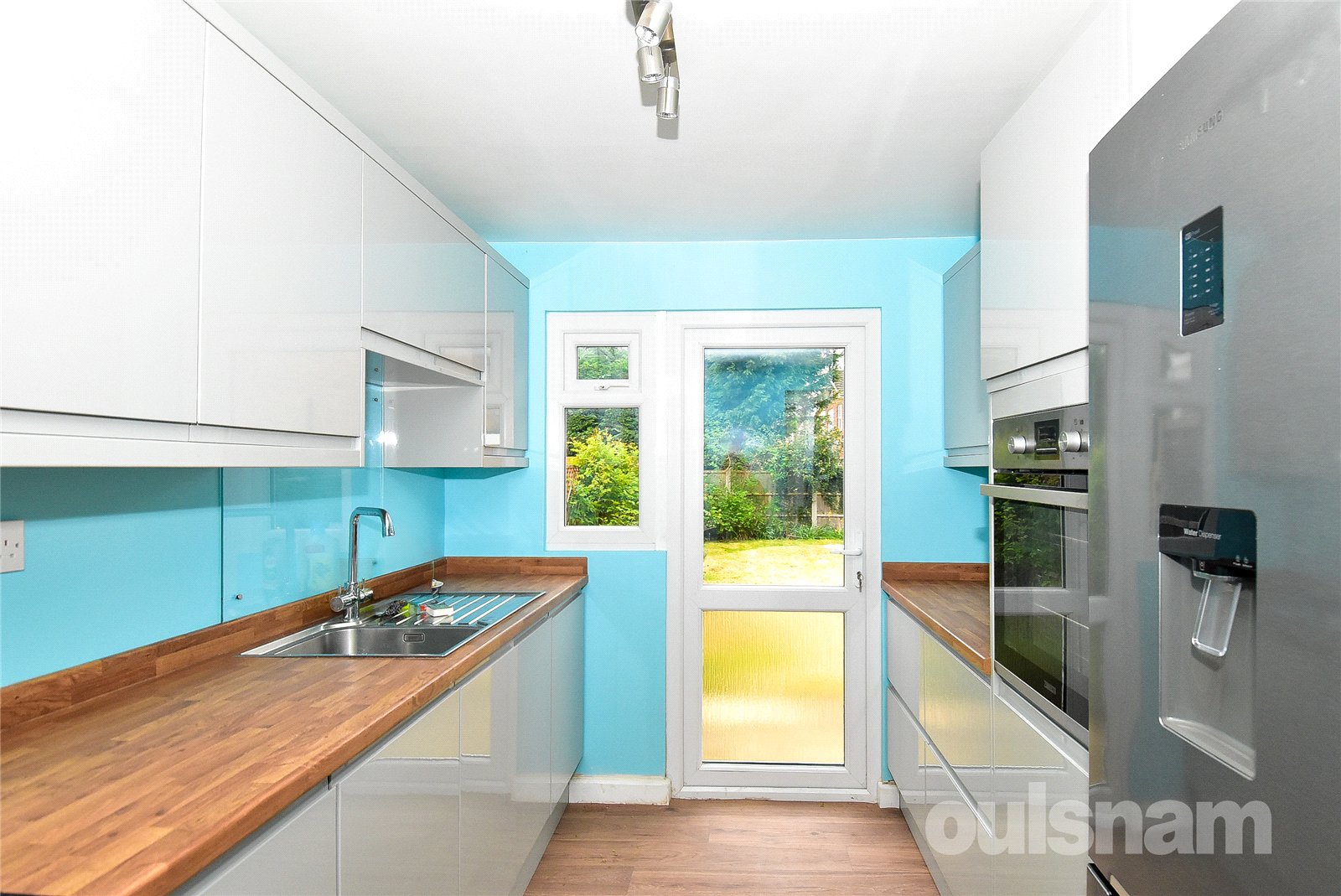 * The kitchen is fitted with a range of base cupboards and wall-mounted units, providing ample storage and workspace. It features an integrated cooker, hob, and extractor fan, with space for a fridge-freezer. A door leads directly to the rear garden, offering easy access for outdoor dining, while a second door provides convenient access to the garage.