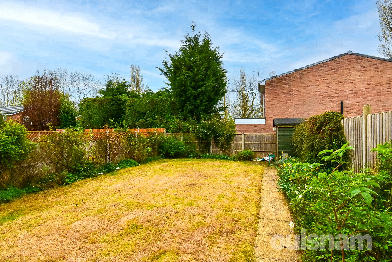 * The rear garden features a paved patio area and a pathway that extends to the rear, leading to a shed. A laid lawn stretches across the garden, bordered by plants and shrubbery, creating a private and attractive outdoor space for relaxation or entertaining.