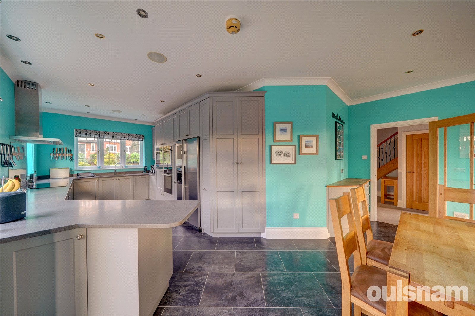 Kitchen/Breakfast Room which has a mixture of wall mounted and base units with marble worktops over, an inset stainless steel one and a half bowl sink, and an induction hob with an extractor hood above. There is an integral dishwasher, twin ovens with grills, a combination microwave with a warming draw below and connections and plumbing for an American fridge/freezer. There are windows looking out to the front and side of the property, a door which is used to the access the side of the property, a door to the utility room and an opening into the,