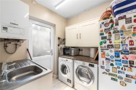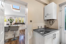 To the rear lies the heart of the home, a stunning open-plan kitchen, dining and family room extension. The kitchen is finished to a high standard and is fully equipped with freestanding appliances, a central breakfast island, and contemporary cabinetry. Two sky lights flood the space with natural light, while bi-fold doors open seamlessly onto the rear paved patio area, perfect for entertaining and family living. Completing the ground floor is a guest WC and a useful utility room, offering additional storage and direct access to both the rear garden.