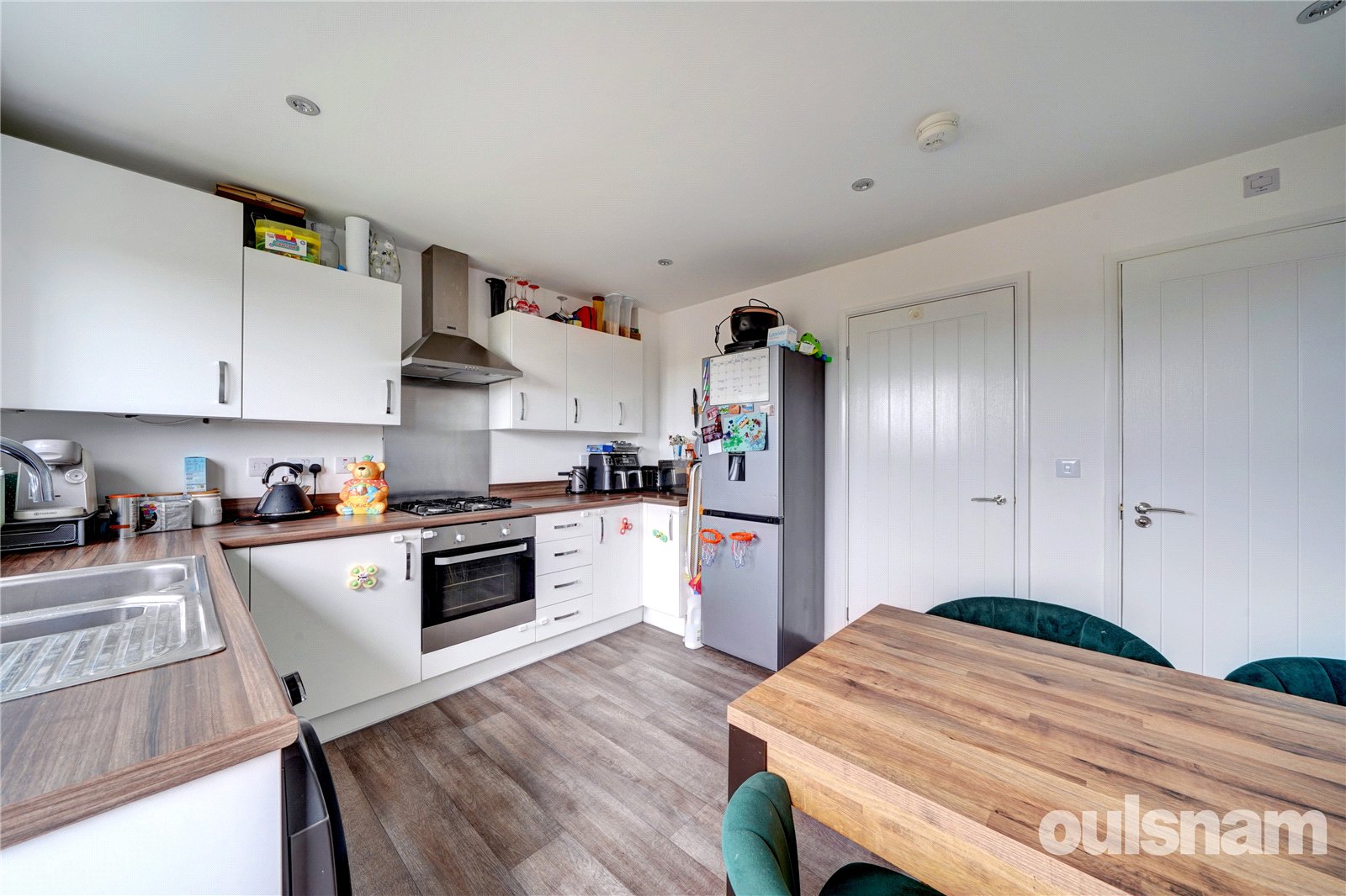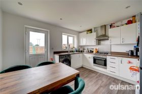 * Kitchen diner with integral oven, four ring gas hob and fitted extractor hood above, space for washing machine and fridge freezer, wall mounted gas central heating boiler concealed behind cupboard. There is a distinct area for a dining table.