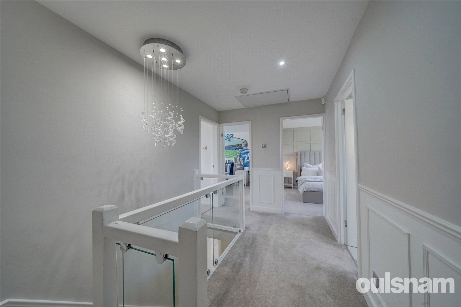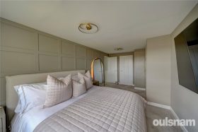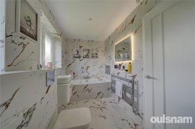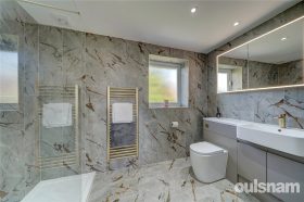 On the first floor is a good size landing with glass ballustrade leading to four double bedrooms. The principal bedroom has stylish panelling, built-in wardrobes and a stunning ensuite, complete with floor-to-ceiling marble-style tiles, a walk-in double shower, a built-in vanity basin, and a low-level WC. The additional three double bedrooms are complemented by a beautifully appointed family bathroom, showcasing elegant marble tiles, a relaxing bath, a separate walk-in shower, and a wall-hung vanity basin, adding a perfect blend of comfort and sophistication to this really superb family home.