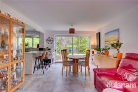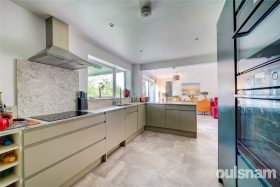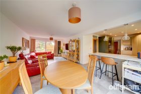 * The impressive open plan family kitchen diner is fitted with a range of self-closing pan drawers and units, integral appliances include a separate fridge and freezer, microwave, combi oven, induction hob with extractor above, dish washer and generous pantry with shelving and built in bin store cupboard, a breakfast bar area with useful front to back cupboards are underneath and is open plan through to the dual aspect living and dining area which has patio doors to both the front and rear aspect allowing light to flood in.