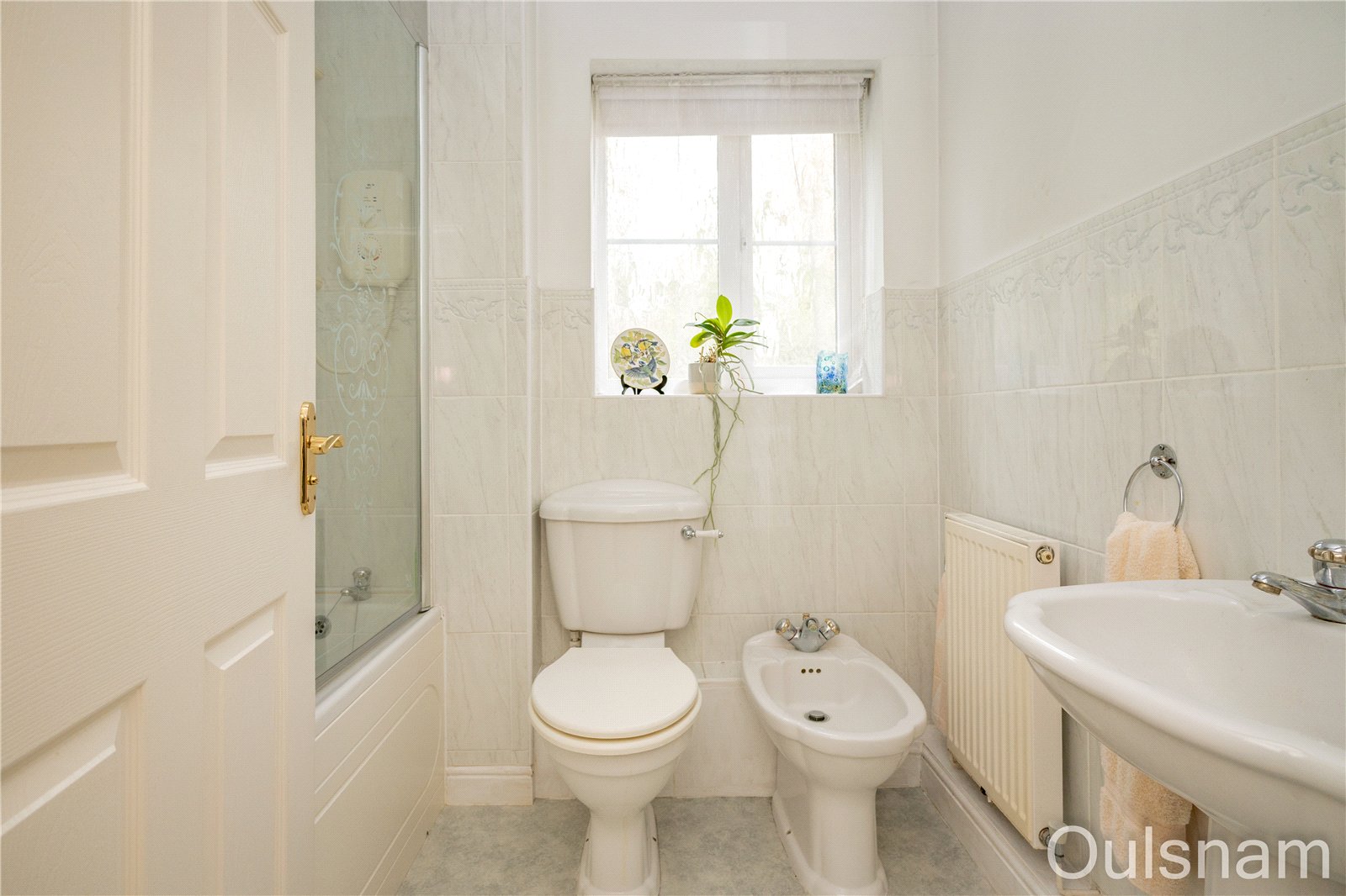 Bathroom which has a low level toilet, a wash hand basin, a bidet and a bath with a shower over. There is a window looking out to the rear.