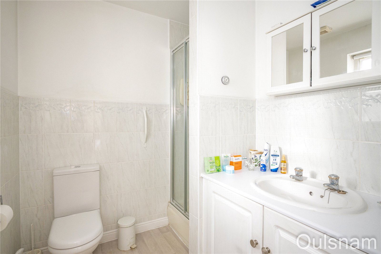 En-Suite which has a low level toilet, a vanity unit with storage and an inset wash hand basin, an enclosed shower cubicle and a window looking out to the front.