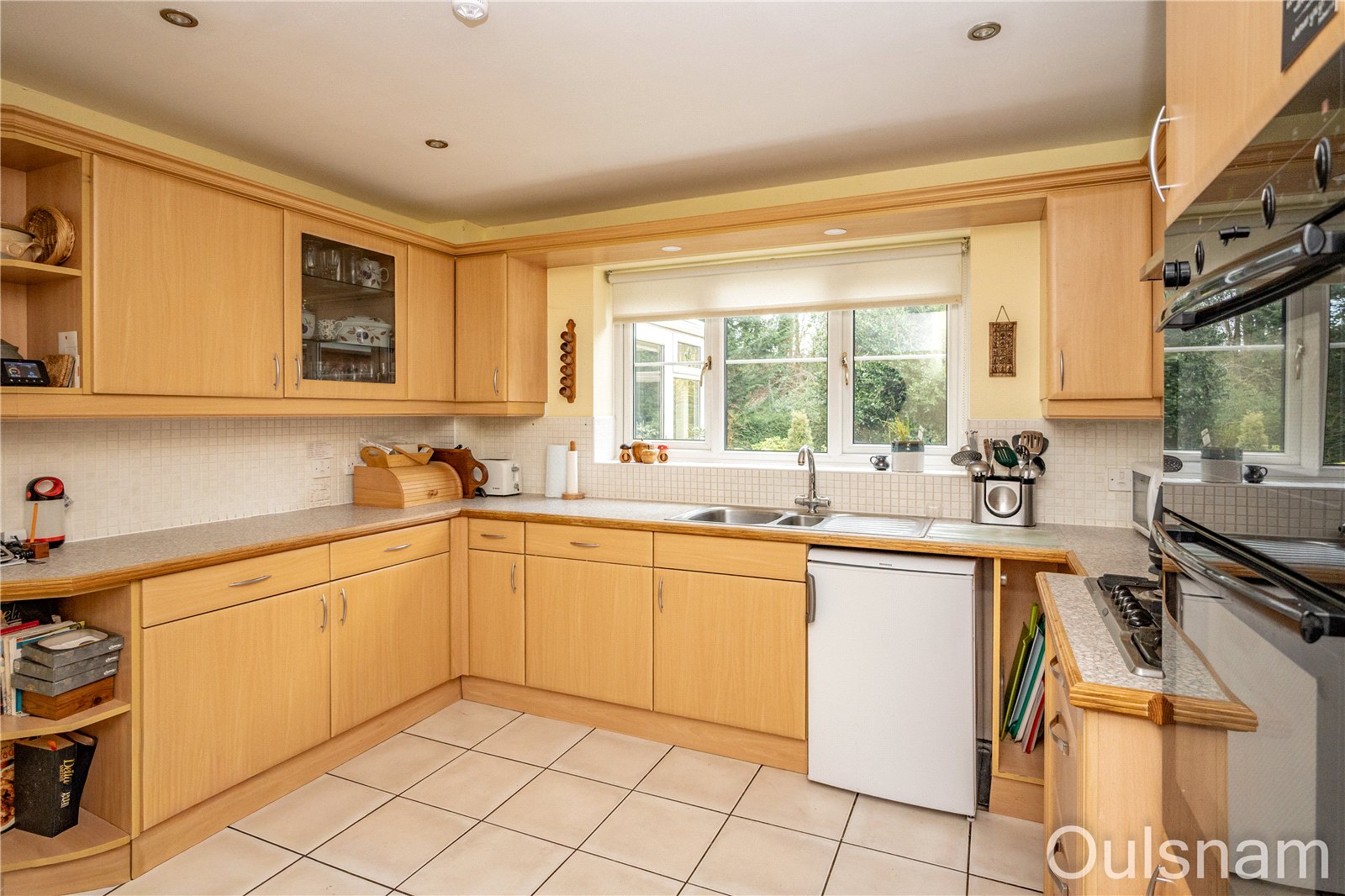 Kitchen which has a mixture of wall mounted and base units with worktops over with an inset stainless steel sink drainer and a five burner gas hob. There is an integral double oven and grill, extractor hood and dishwasher and connections for a further undercounter appliance. There is a window looking out to the rear of the property, a door to the hallway and an opening into the,