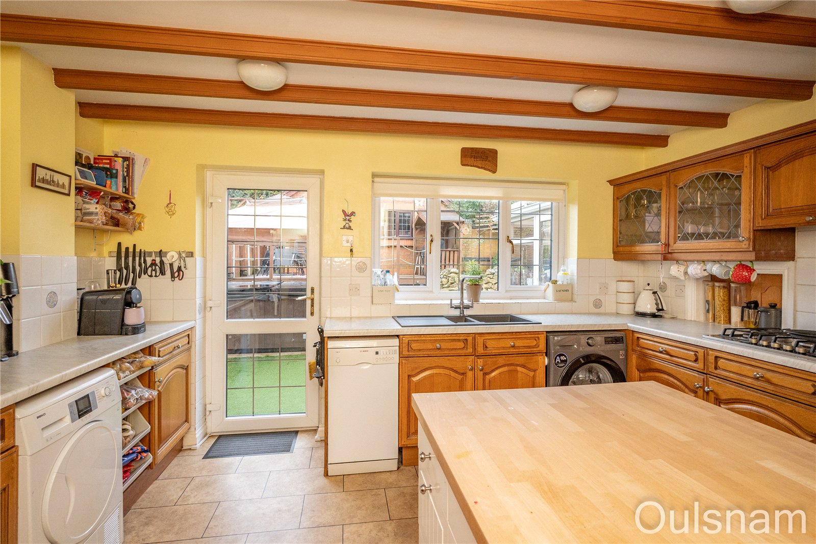 Kitchen/Breakfast room which has a mixture of wall mounted and base units with worktops over with an inset composite sink drainer. There is an integral double oven and grill, a five burner gas hob and an extractor hood above. There are connections for an American fridge/freezer, an integrated under counter fridge, a washing machine and a dishwasher with integrated slide out bin. There is a window looking out to the rear, a serving hatch into the dining room and a door to the rear garden.