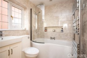 Bathroom which has a bath with a shower over, a low level toilet, a vanity unit with storage and an inset wash hand basin, wall mounted 'LED' lit mirror with storage behind, shaver charger point and a window looking out to the side.
