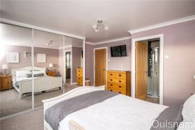 Bedroom one which has fitted wardrobes, a window looking out to the front and a door to the,