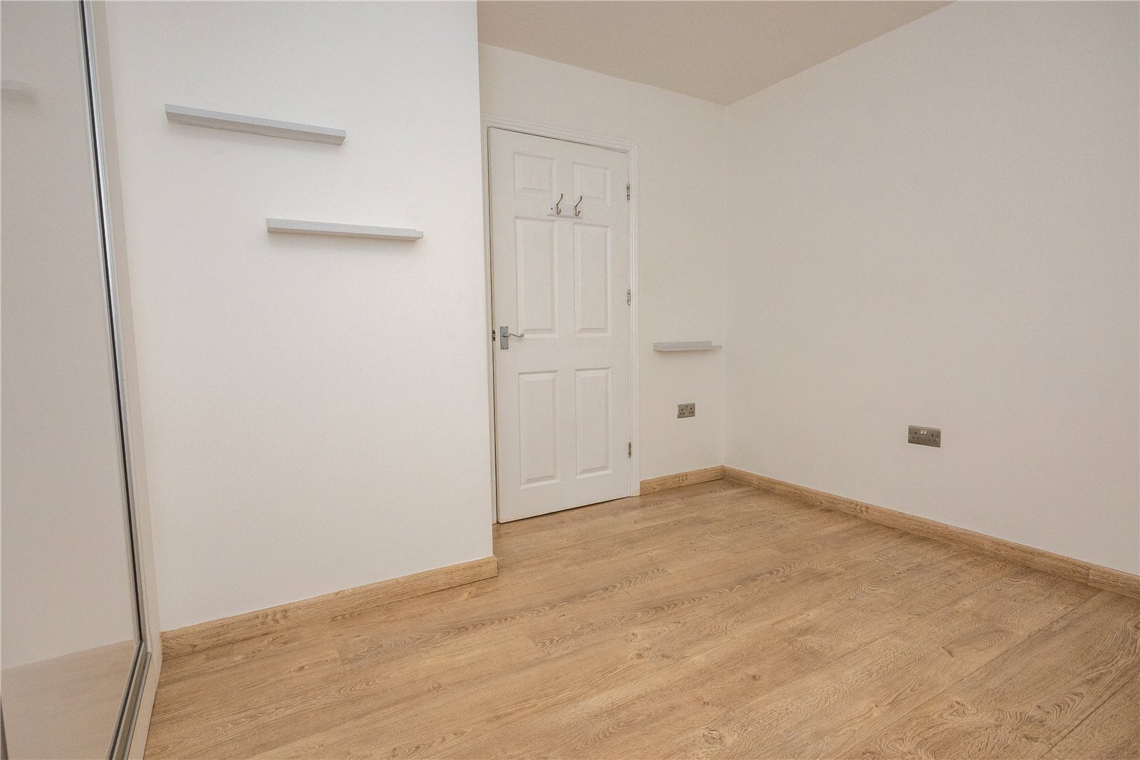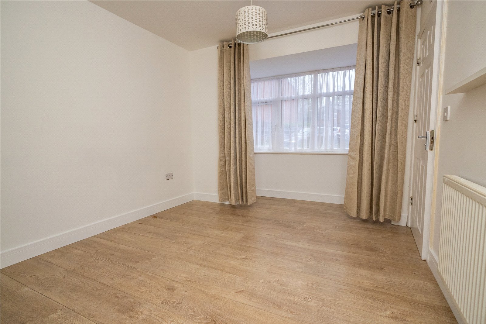 Bedroom one has a feature walk-in bay window to the front, fitted double wardrobe with sliding doors, wood effect flooring and door to the en-suite shower room with white suite.