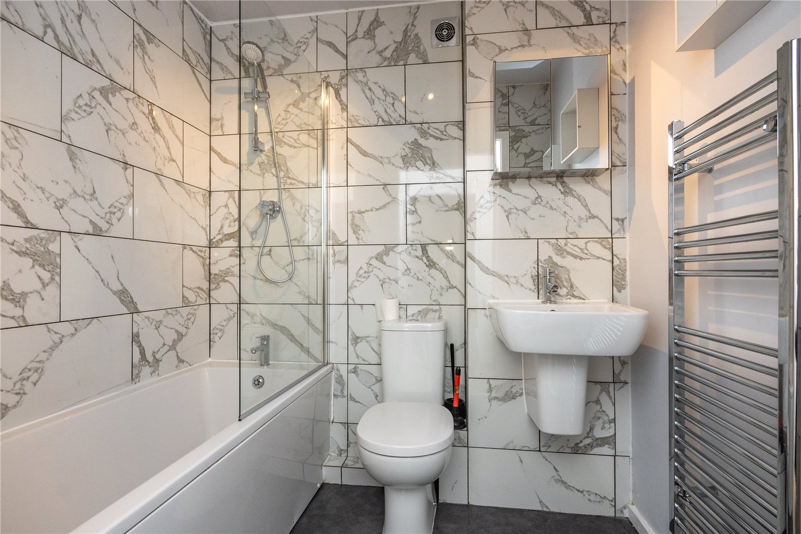 The inner hall gives access to both bedrooms and an attractive part tiled bathroom with white suite comprising panelled bath with chrome shower over & glass shower screen, wall mounted wash hand basin & low level w.c. There is a chrome heated towel rail and mirror fronted cosmetic cabinet.