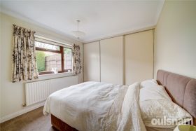 Having UPVC double glazed window to rear elevation, fitted dressing table shelf with drawers beneath and a range of built in wardrobes to one wall with shelving and hanging space, central heating radiator and a wooden panel door leads into the