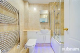 Fitted with a contemporary style white suite comprising L-shaped panel bath with shower above and two separate shower heads, complementary glazed screen and tiling to all walls, low level dual flush WC and wash hand basin with mixer tap set into vanity unit with cupboards and plinth lighting, ladder style heated towel rail/radiator and ceiling down lights.