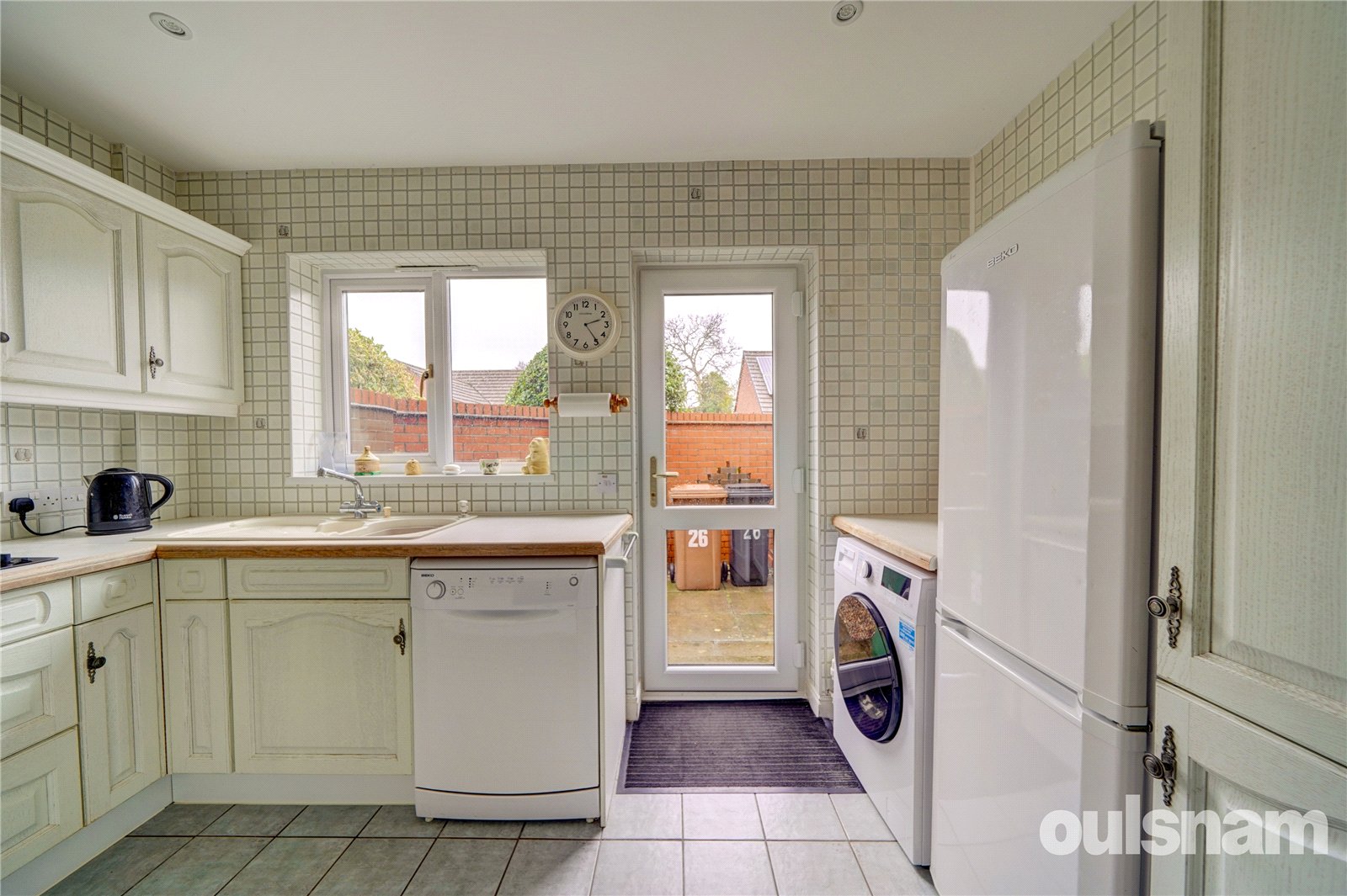 Having UPVC double glazed window and door onto side elevation, central heating radiator, ceiling down lights and fitted with a range of wall mounted and base units with work surfaces over, incorporating a one and a half bowl sink and drainer with mixer tap, integral oven, four ring hob with extractor hood above, space for a tall standing fridge freezer, space for washing machine, space for dishwasher, tiled walls and floor.