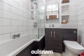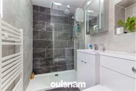 en-suite shower room comprising wc, vanity sink unit, shower and heated towel rail.