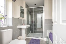 En-suite which has a bath, an enclosed double shower, a wash hand basin, a low level toilet and a frosted window looking out to the rear of the property.