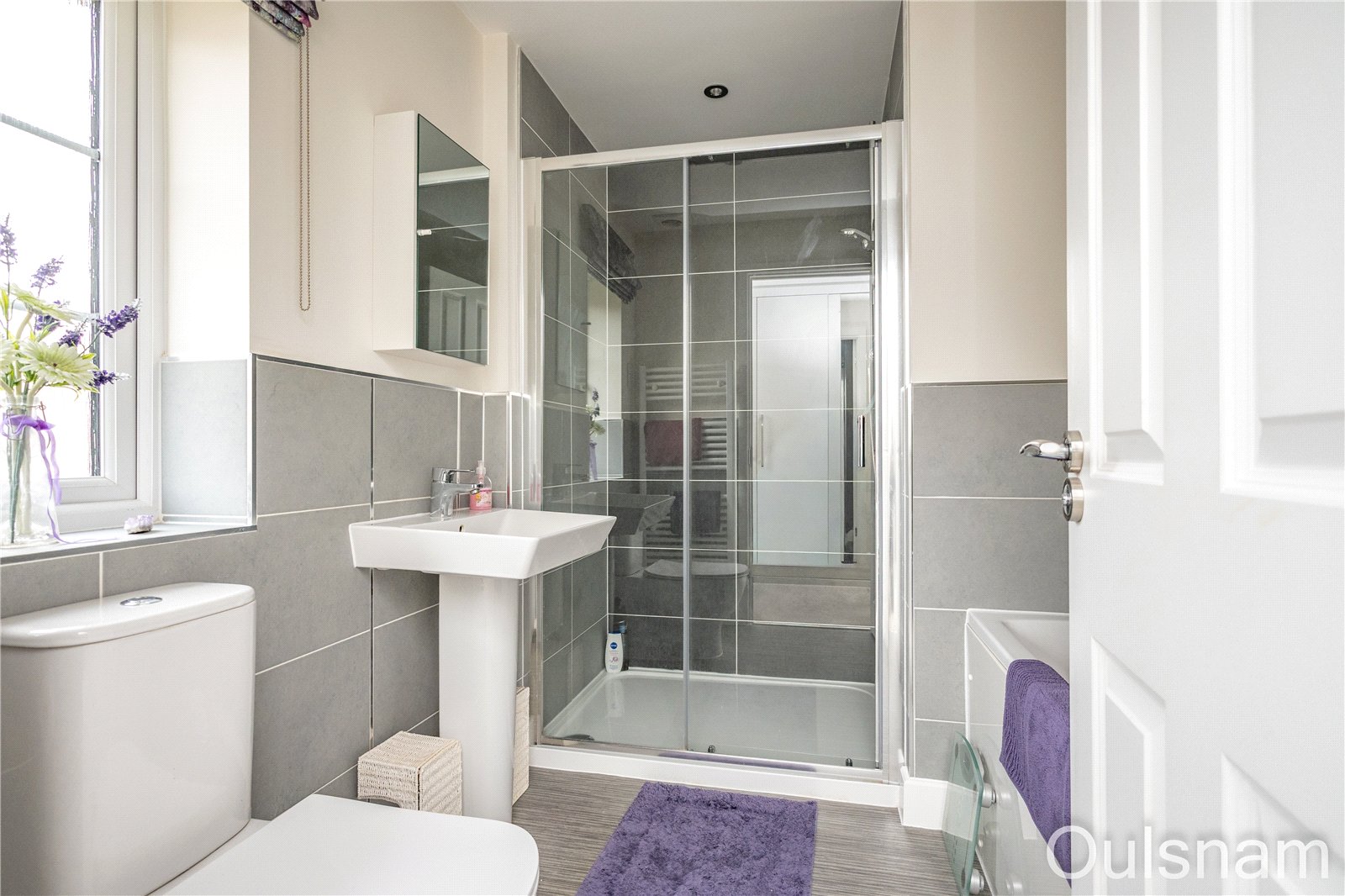 Bathroom which has a bath, an enclosed shower cubicle, a wash hand basin, a low level toilet and a frosted window looking out to the rear of the property.