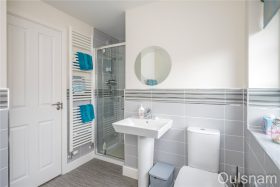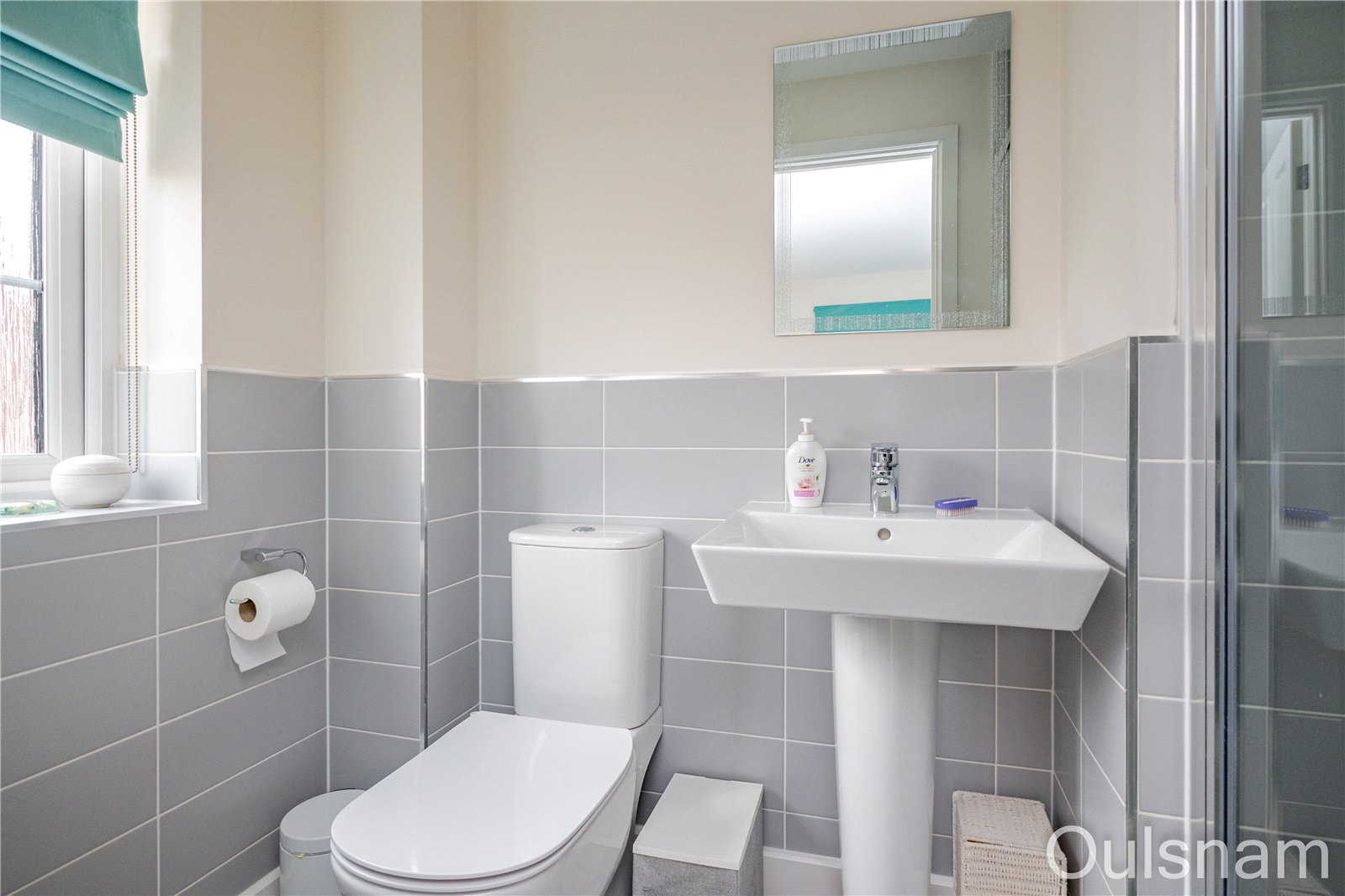 En-suite which has an enclosed shower cubicle, a wash hand basin, a low level toilet and a frosted window looking out to the side of the property.