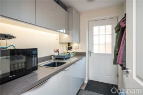 Utility room which has a mixture of wall mounted and base units with laminate worktops over with an inset stainless steel sink drainer. There is a washing machine and under-counter freezer and a door which opens out to the side of the property.