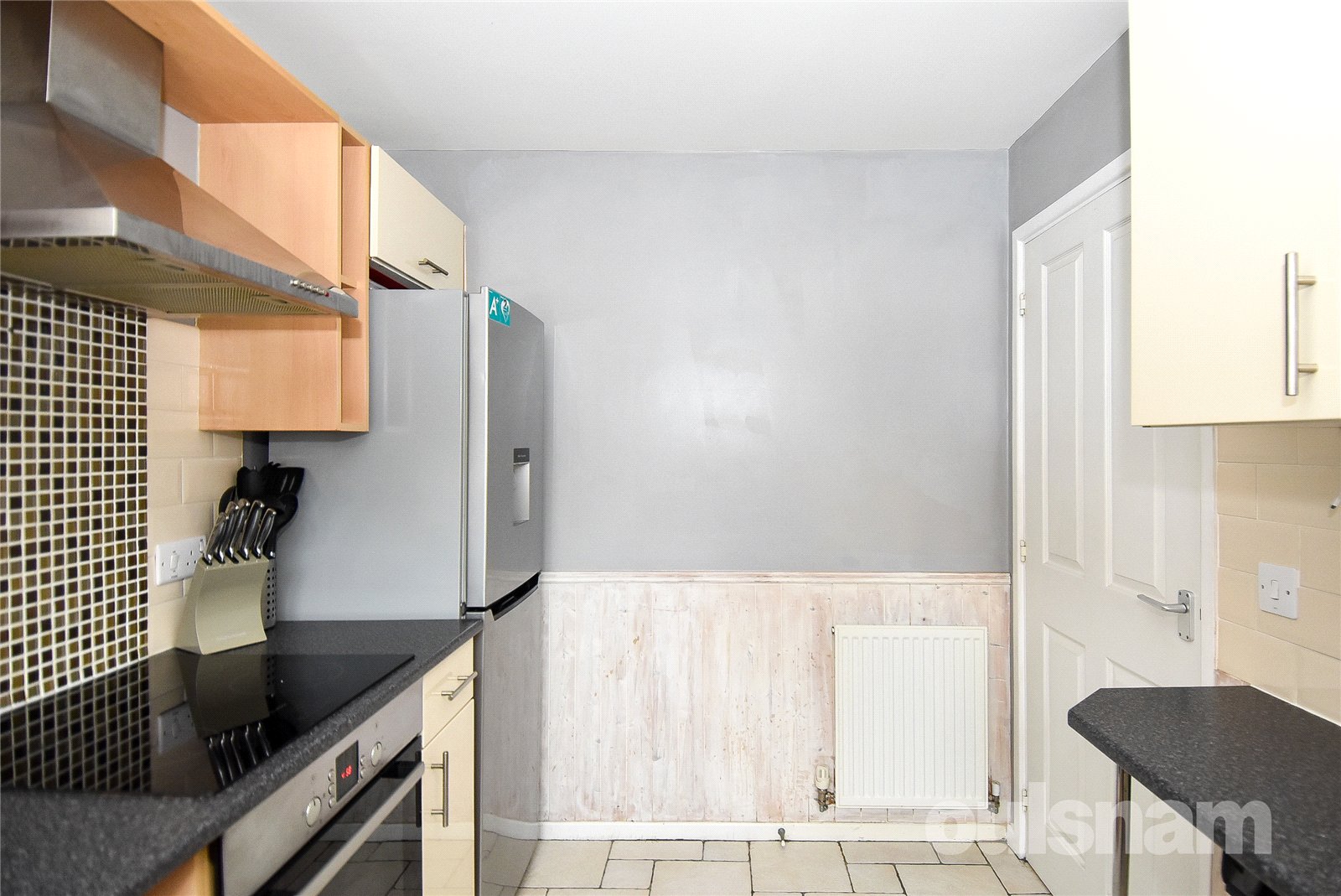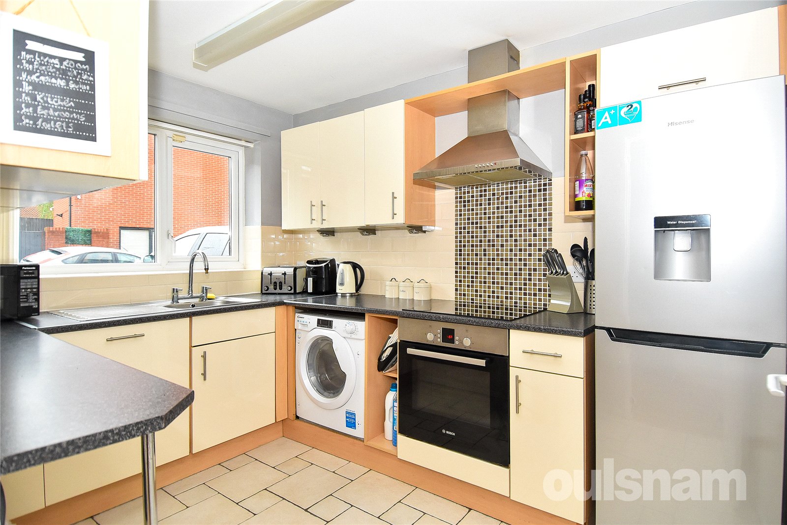 * The kitchen is fitted with a range of base cupboards and matching wall-mounted units, offering ample storage. It features an integrated oven, hob, and extractor fan, providing a practical and streamlined cooking area. There is space for a fridge freezer as well as space and plumbing for a washing machine, making the kitchen both functional and well-equipped for everyday living.