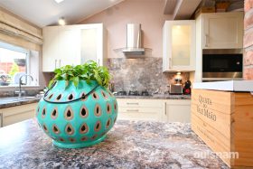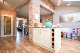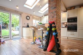 * The kitchen diner boasts feature exposed brick pillar, fireplace and surround, three sky light windows and bi-fold doors opening onto the garden. Kitchen is complete with integral microwave, oven, five ring gas hob and dishwasher