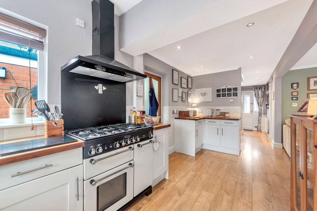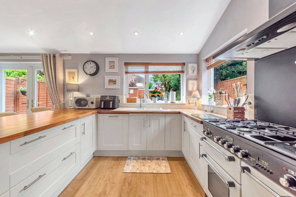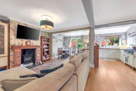 The open plan kitchen, dining, and lounge area features a cozy log burner, perfect for creating a warm ambiance, while double doors seamlessly connect the space to the rear garden, ideal for entertaining.