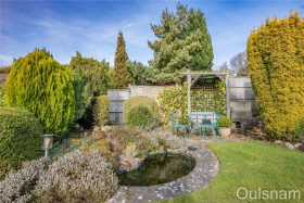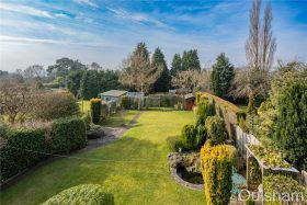 Rear garden which has a raised patio area with steps down to a turfed lawn. A pathway runs to the second section of the garden which is separated by a wood trellis. There are multiple workshops located at the end of the garden and a greenhouse. A pond is located towards the top of the garden and there is a door to the,