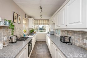 Kitchen which has a mixture of wall mounted and base units with worktops over with an inset stainless steel sink drainer. There is an integral gas hob, electric oven, a dishwasher and fridge. There are windows looking out to the rear and side and a door to the,