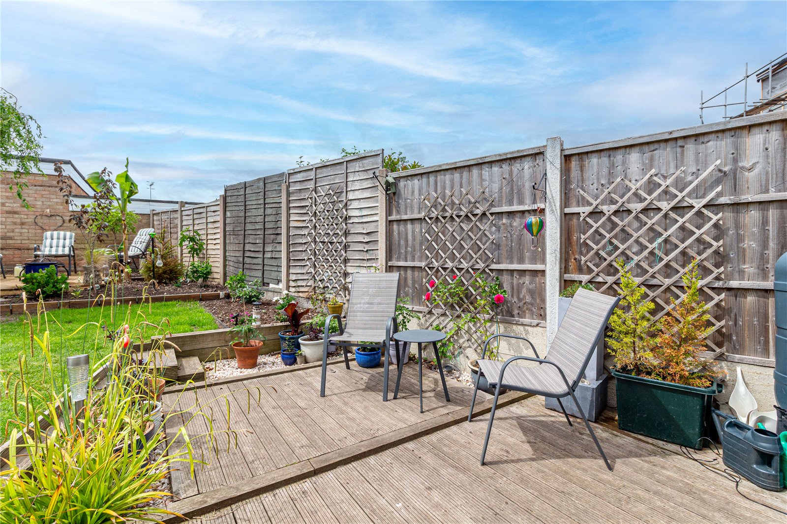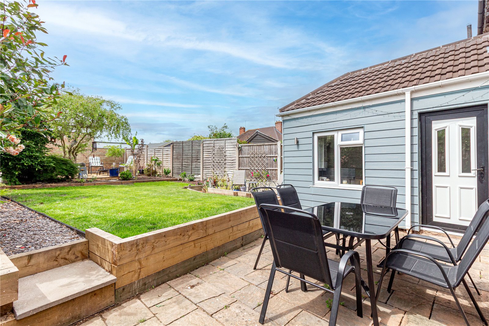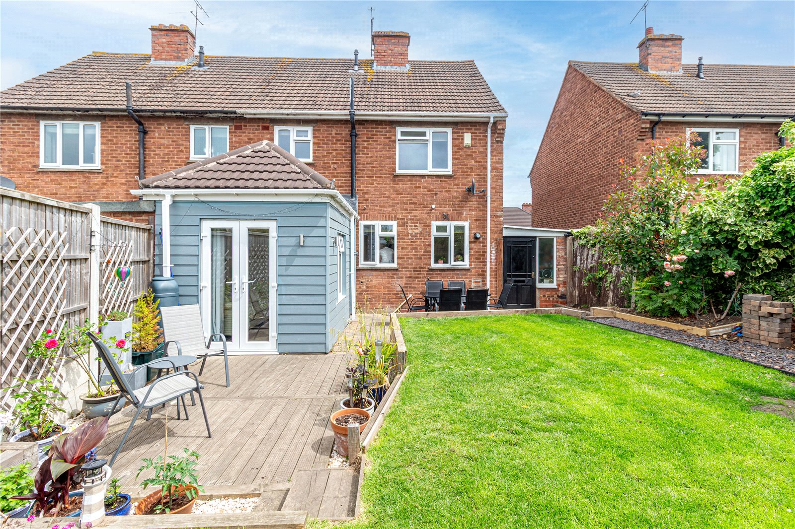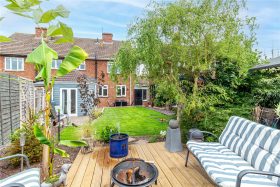 * A generously sized rear landscaped garden features patio areas, additional paved seating area ideal for al-fresco dining, an established lawn, planted borders and a side door to the property gives covered access to the front of the property, currently used for storage.
