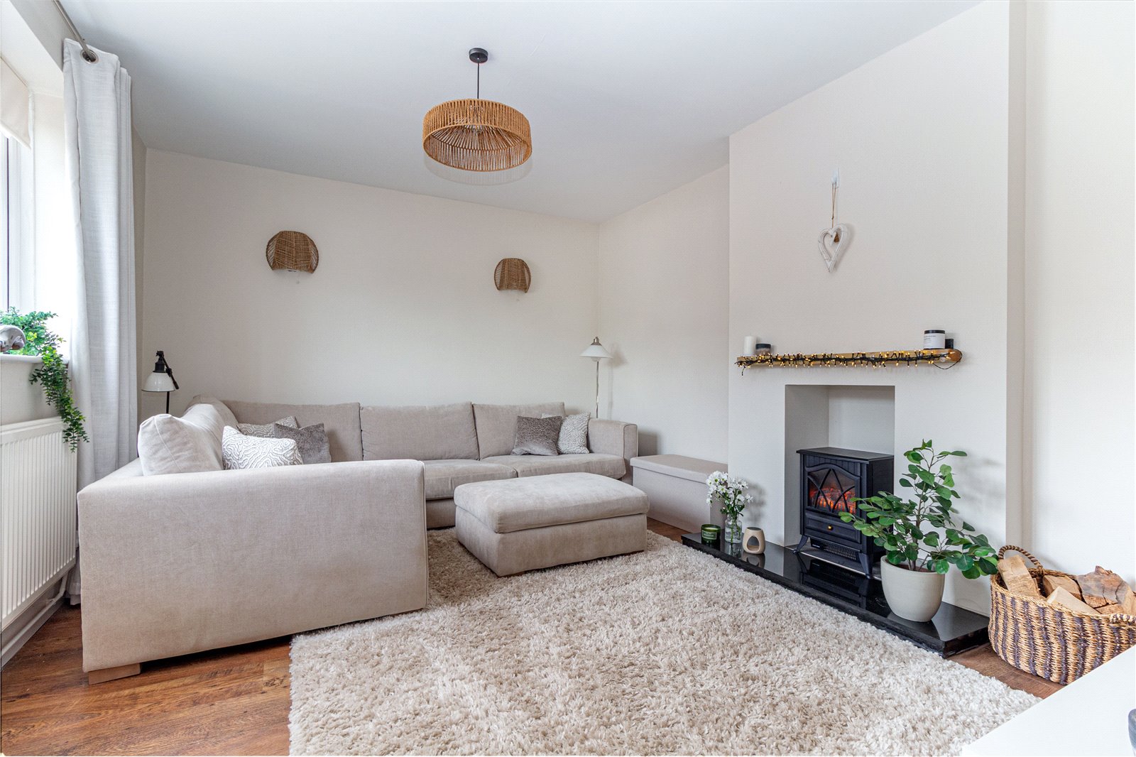 * Generous lounge is light an airy and has a contemporary style feature fireplace with electric fire inset.