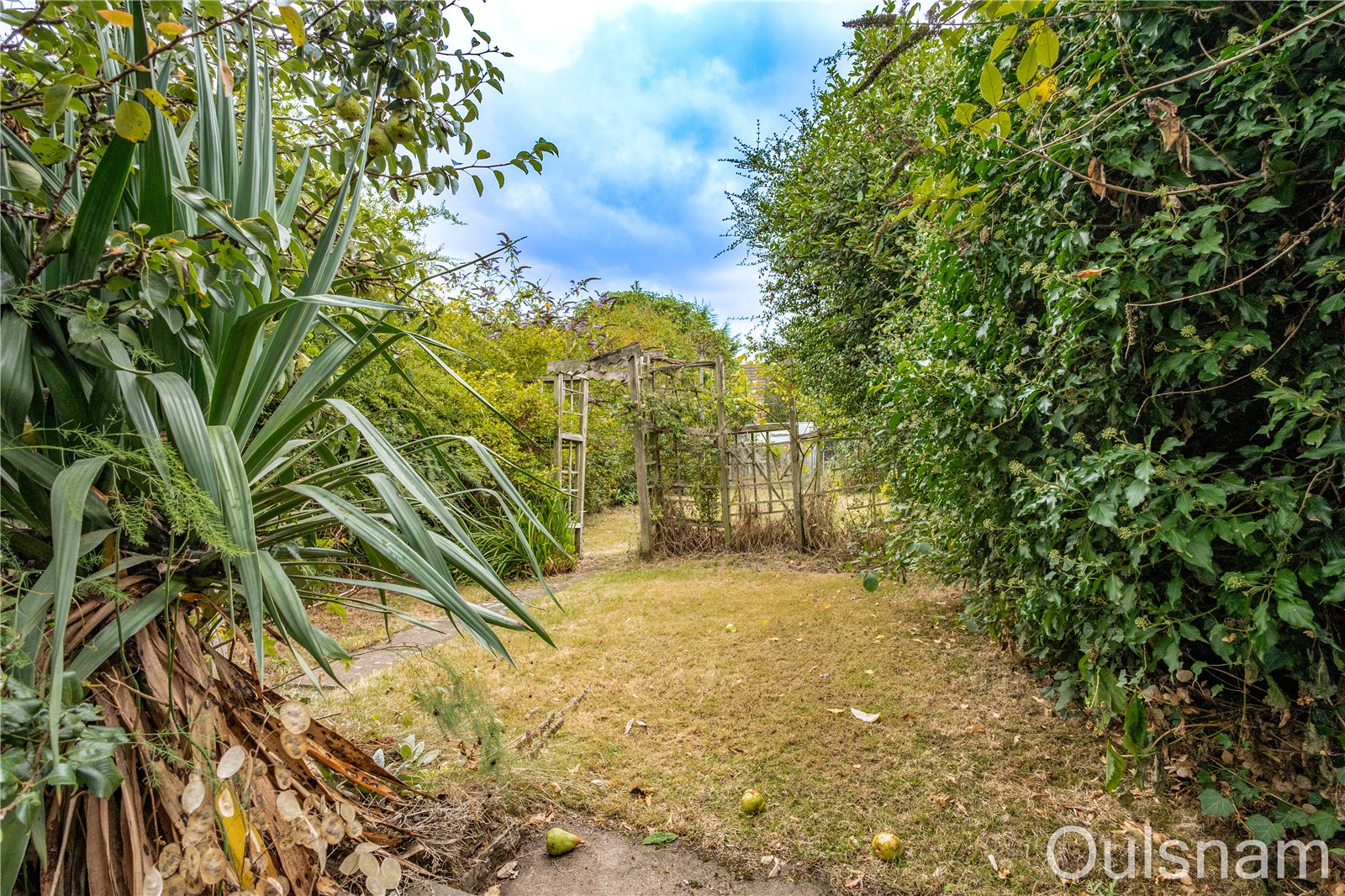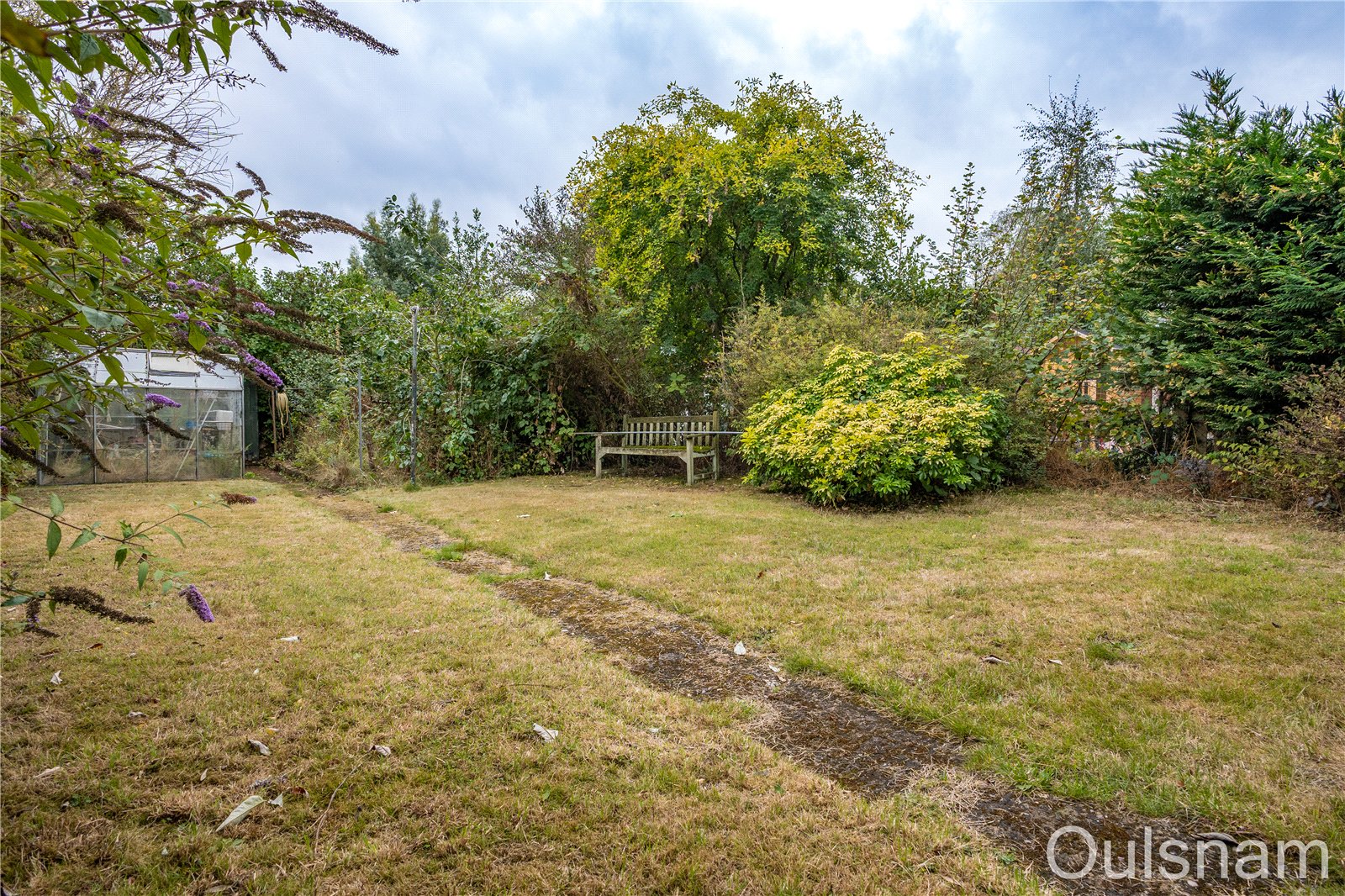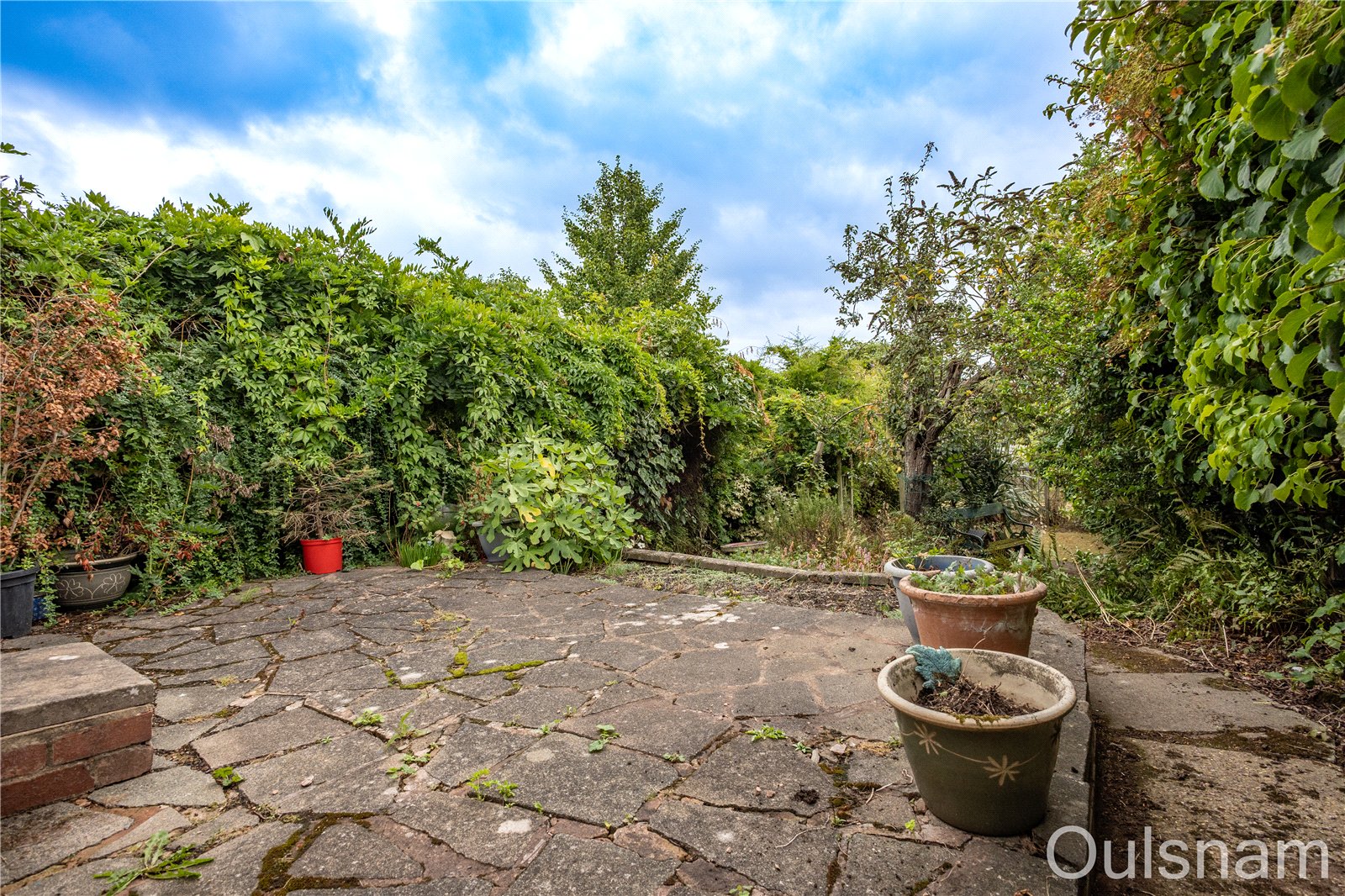 Rear garden which is tiered with a patio area and turfed lawns. There is a mixture of mature plants, trees, shrubs and flowers spread across the garden.