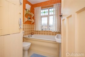 Bathroom which has a bath, a wash hand basin, a low level toilet, access to an airing cupboard and a window looking out to the front.