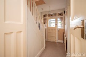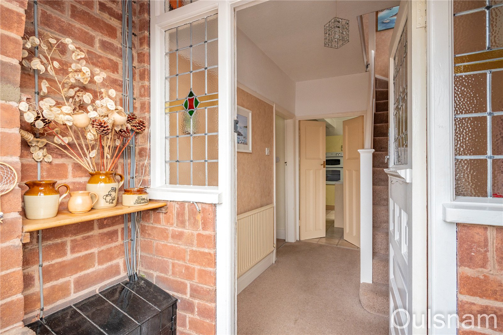 Entrance porch which has windows looking out to the front, stained glass windows into the hallway and a door to the,