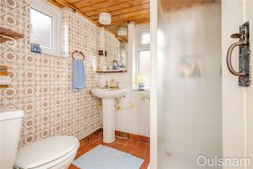 Shower room which has an enclosed shower cubicle, a wash hand basin, a low level toilet and windows looking out to the side and the rear.