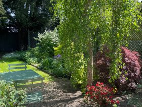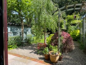 * Delightful and mature rear garden with patio area, outside water tap, archway with trellis containing and climbing roses. Gravelled area with pathway down to the lawn, flower beds to sides containing a mixture of mature shrubs and plants, shed offering useful storage or potential work space with electric power, lighting, insulation and also being alarmed. Boundaries are a mixture of fencing and brick wall to the left hand side.