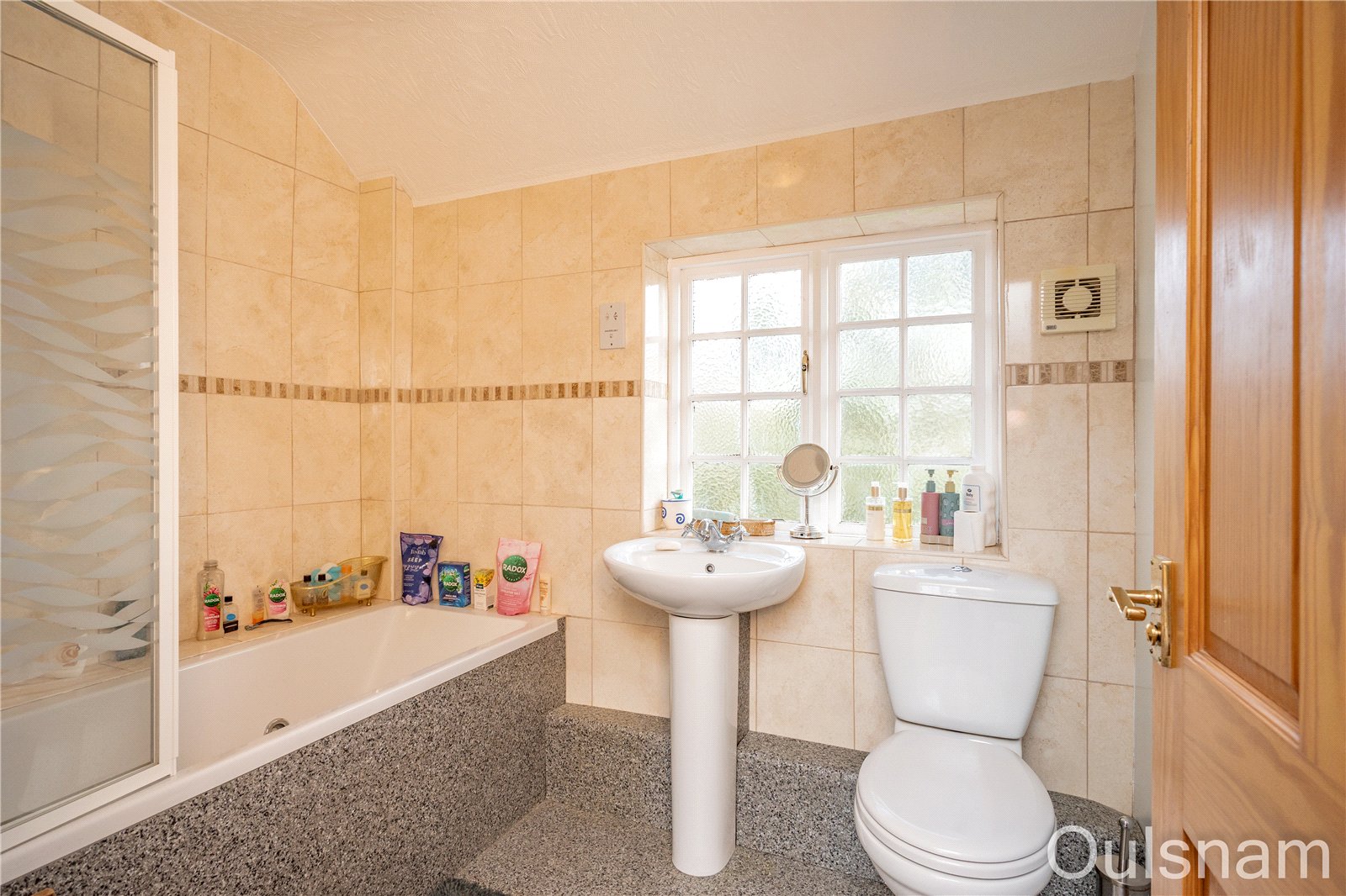 Bathroom with window to the side, shaver point, heated towel rail and fitted suite comprising panelled jacuzzi bath, electric shower over bath, close-coupled WC and wash hand basin.